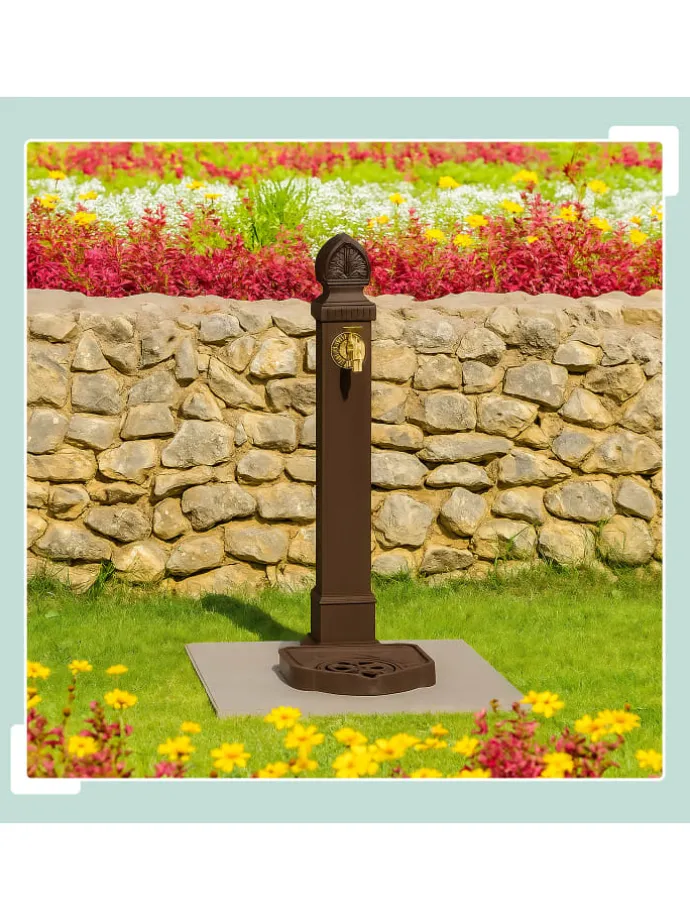 Verleihe Deinem Garten oder Deiner Terrasse nostalgischen Charme mit diesem Standbrunnen im Antik-Design. Egal ob rein dekorativ, zum Hände waschen nach der Gartenarbeit oder um Wasser für das Blumengießen zu zapfen – der Metallbrunnen macht immer eine gute Figur. Der Gartenbrunnen ist mit Wasserhahn und Becken ausgestattet, welches bei Bedarf mit dem beiliegenden Stöpsel verschlossen werden kann. Das Gitter ist ideal zum Abstellen von Gießkannen, Blumentöpfen oder anderen Gegenständen.