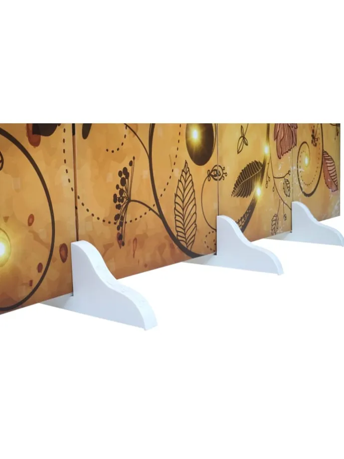 Um Ihre Trennwand in voller Pracht und Breite zur Geltung zu bringen, bieten wir daher eine besonders schmucke Lösung: weiße Standfüße mit Ornament-Struktur. Ganz einfach zwischen die einzelnen Abteile platziert, geben sie dem Paravent nicht nur ausreichend Stabilität um gerade zu stehen, sondern versetzen den Paravent auch in ein „“standesgemäßes““ Gesamtbild. Sie haben auch die Möglichkeit die Standfüße an Ihrem Paravent festzuschrauben, dank speziell vorgebohrter Löcher in der Mitte der Füße.