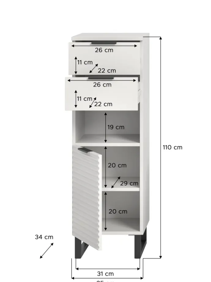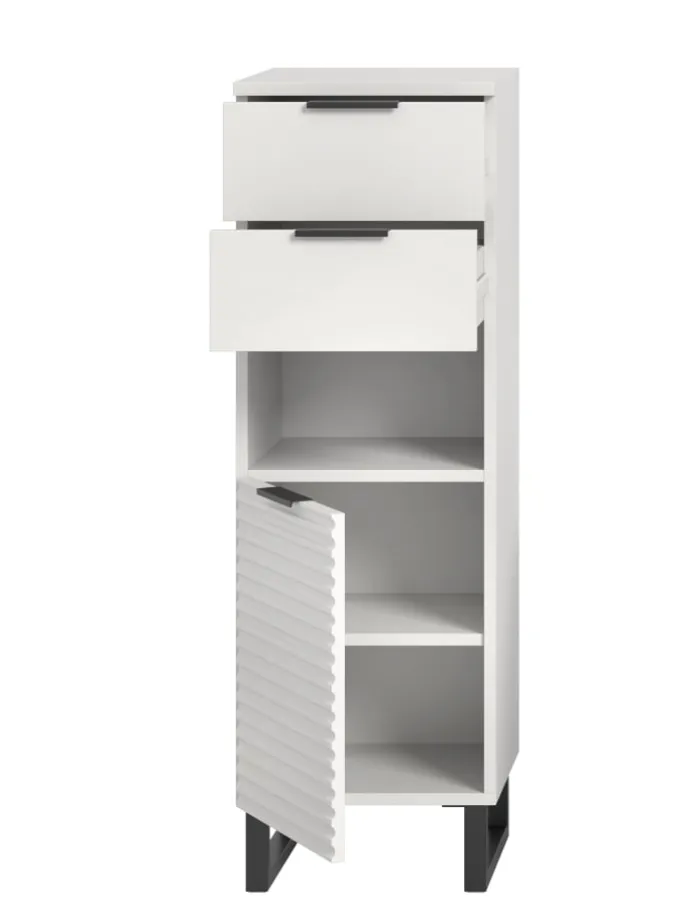 Dieser elegante Badstandschrank in Weiß Nachbildung bringt modernes Design und Funktionalität in Ihr Badezimmer. Mit den Maßen von 35 cm Breite, 110 cm Höhe und 34 cm Tiefe bietet er ausreichend Stauraum für Handtücher, Pflegeprodukte und vieles mehr, ohne viel Platz einzunehmen.Das Highlight dieses Badmöbels ist die hochwertige Rillenoptik, die für eine besondere, stilvolle Ausstrahlung sorgt. Die feinen Linien und das matte Weiß harmonieren perfekt und verleihen dem Badschrank eine zeitlose Eleganz, die in jedes Badezimmerdesign passt.Besonders hervorzuheben ist der stabile Kufenfuß, der nicht nur für einen sicheren Stand sorgt, sondern auch einen modernen, schwebenden Look kreiert. So wird der Stand- und Aufbewahrungsschrank zu einem echten Hingucker in Ihrem Bad.