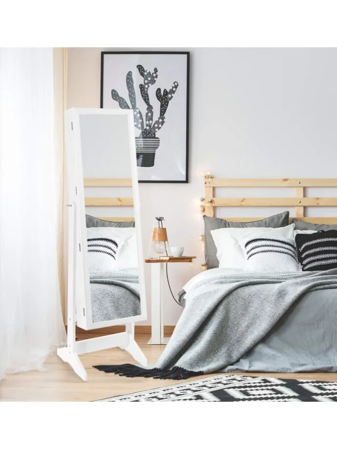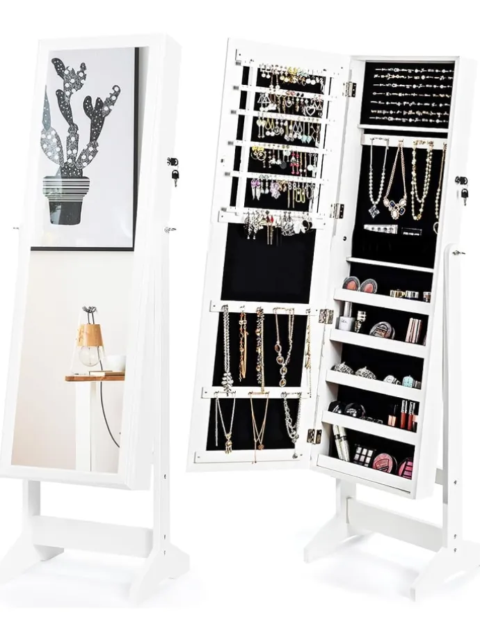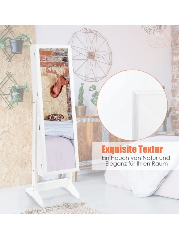 Unser 2-in-1-Schmuckschrank ist der perfekte Begleiter für jede Frau mit einer reichen Schmuckkollektion. Dieser freistehende Schmuckschrank aus hochwertigem MDF gewährleistet eine langfristige Nutzung. Der Schmuckorganisator umfasst 108 Ohrringschlitze und 36 Ohrringlöcher, 98 Ringschlitze, 18 Halskettenhaken, 5 Aufbewahrungsregale und 1 staubdichte Tasche. Der unterteilte Stauraum mit großem Fassungsvermögen ermöglicht es Ihnen, alle Ihre Sammlungen im Schrank unterzubringen. Und das abschließbare Design hilft, Ihren Schmuck sicher zu halten. Darüber hinaus bietet Ihnen der 4-fach verstellbare Ganzkörperspiegel eine umfassende Sicht auf Ihr Äußeres. Mit schöner Holzmaserung und stilvollem Aussehen ist er ein Blickfang in Ihrem Zuhause.