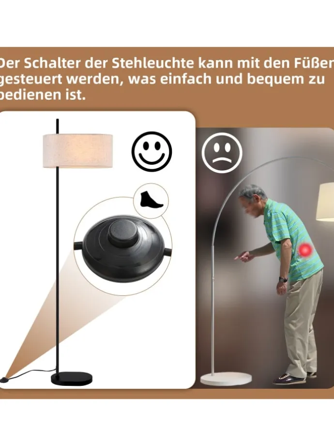 [Stabil und langlebig] Der Standfuß der Stehleuchte im Retro-Stil besteht aus einem stabilen schwarzen Metallstab und bietet dadurch besonders guten Halt. Die Höhe der Lampe beträgt 154 cm und die Breite 40 cm. In Kombination mit dem dicken Sockel steht die Stehleuchte fest und kippt nicht um – so wird sicher verhindert, dass Kinder oder Haustiere sie umwerfen. Diese stabile und attraktive Stehlampe ist perfekt für jeden Retro-Industrieraum. [Freie Wahl]Die Wohnzimmer-Stehleuchte ist für E27-Leuchtmittel (maximal je 40W) geeignet. So können Sie eine Lichtquelle basierend auf Ihren Farbtemperatur- und Helligkeitsvorlieben auswählen. Dies gibt Ihnen mehr Kontrolle während der Nutzung und die Flexibilität, auf die spezifischen Bedürfnisse und Bedingungen Ihres Raums zu reagieren, um eine optimale Beleuchtung und ein angenehmes visuelles Erlebnis zu gewährleisten (ohne Leuchtmittel). [Einfach zu verwenden] Die Stehleuchte im Vintage-Stil wird mit einer Bedienungsanleitung und allen erforderlichen Installationsmaterialien geliefert. Sie können die Glühbirne ganz einfach selbst installieren. Die Installation ist schnell und einfach. Geeignet für verschiedene Räume wie Wohnzimmer, Schlafzimmer, Arbeitszimmer, Büro usw. Sie kann sowohl als allgemeine Innenbeleuchtung als auch als Leselicht verwendet werden.Stehlampe in schwarz 1-flammige E27 mit Stoff Lampenschirm