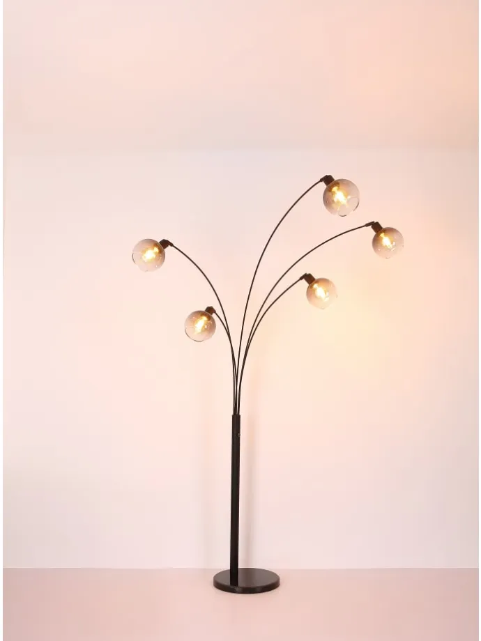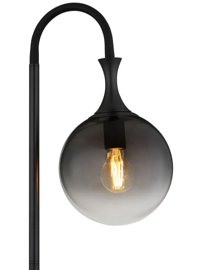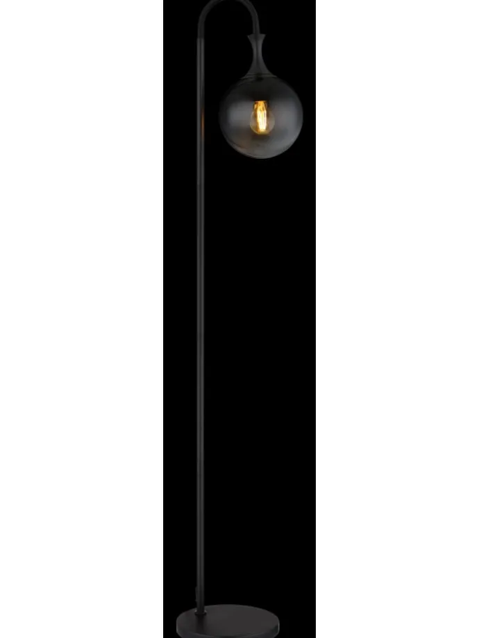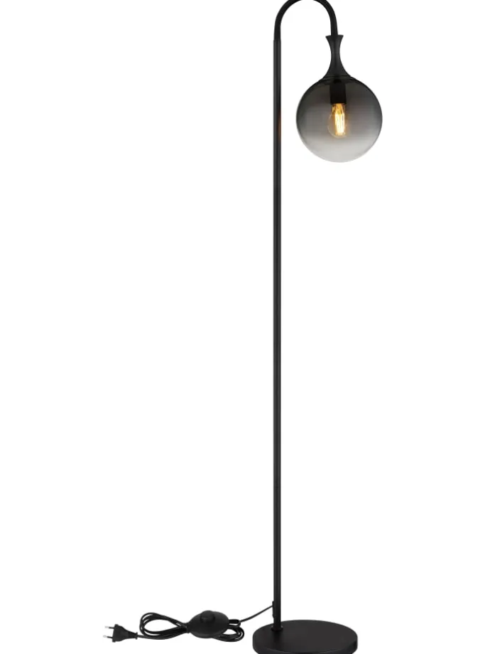 Stehleuchte Metall schwarz matt, Glaskugel rauchfarben, Kabel PVC Schwarz, Fußtrittschalter im Kabel, LxBxH: 290x250x1520mm, Kabellänge 1800mm, exkl. 1x E27 LED 10W 230V