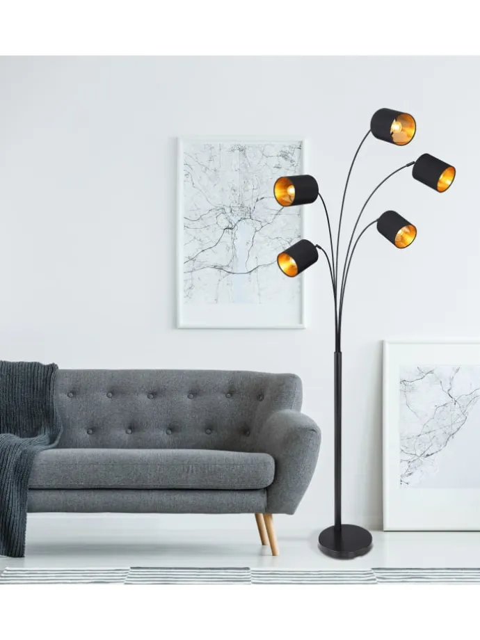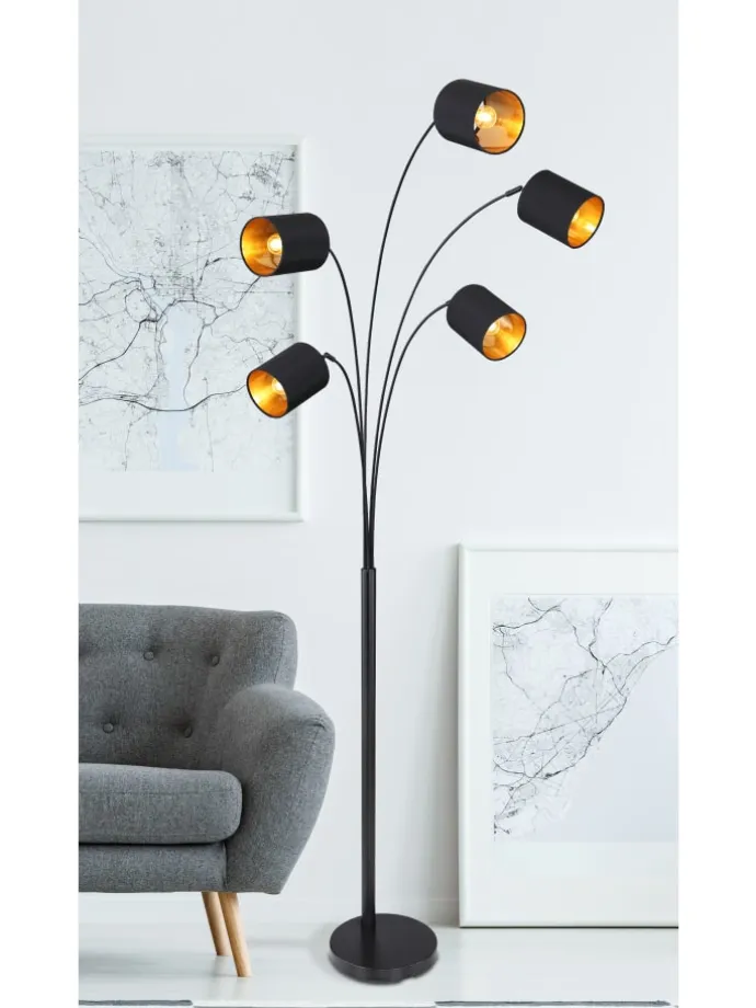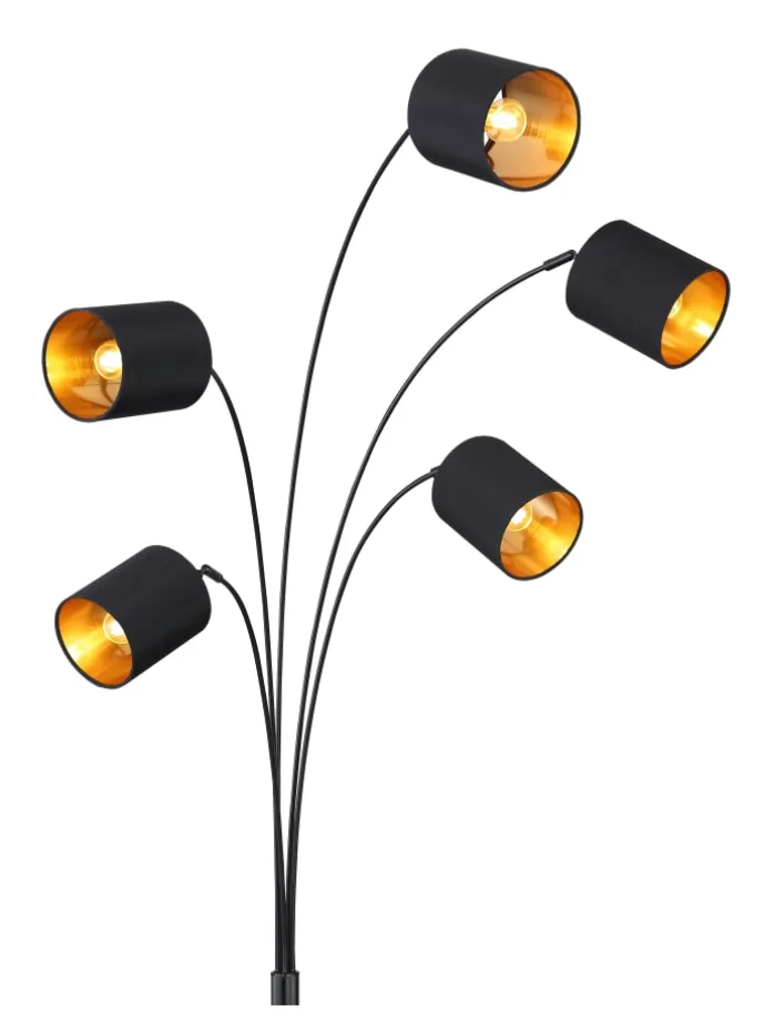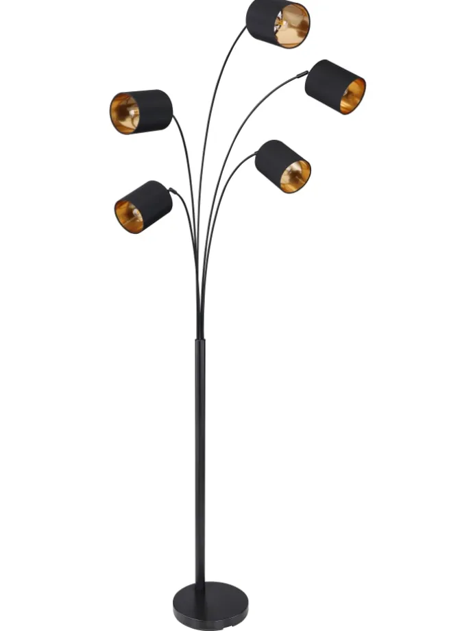 Stehleuchte Metall schwarz matt, Textil schwarz, Kunststoff goldfarben, Fußtrittschalter im Kabel, LxBxH: 740x700x2040mm, Kabellänge 2000mm, exkl. 5x E14 40W 230V