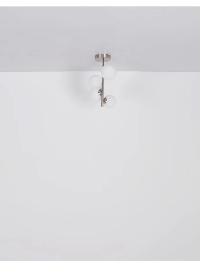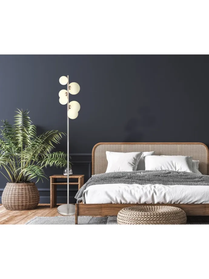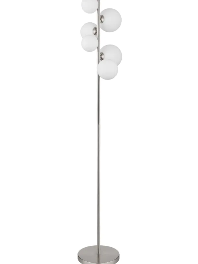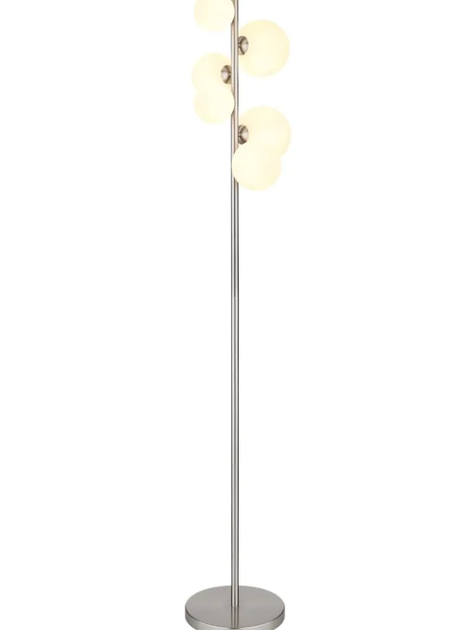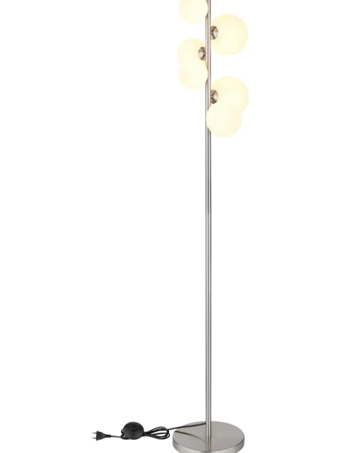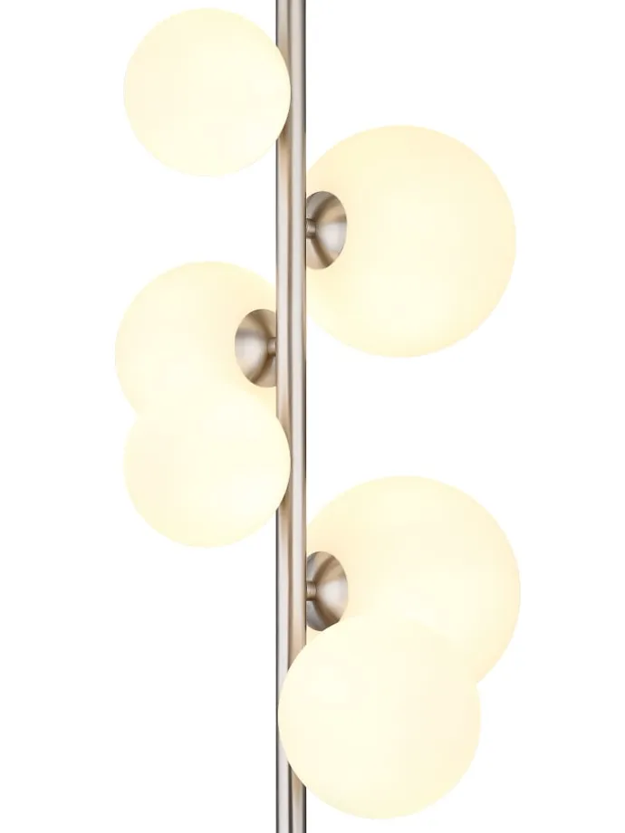 Stehleuchte Metall Nickel matt, Glas opal, Kabel PVC Schwarz, Fußtrittschalter im Kabel, LxBxH: 295x280x1550mm, Kabellänge 1900mm, Glas-DM: 2x10cm, 2x12cm, 2×15 cm, inkl. 6x G9 LED 3.5W 230V, 350lm Source, 310lm Output, 3000K