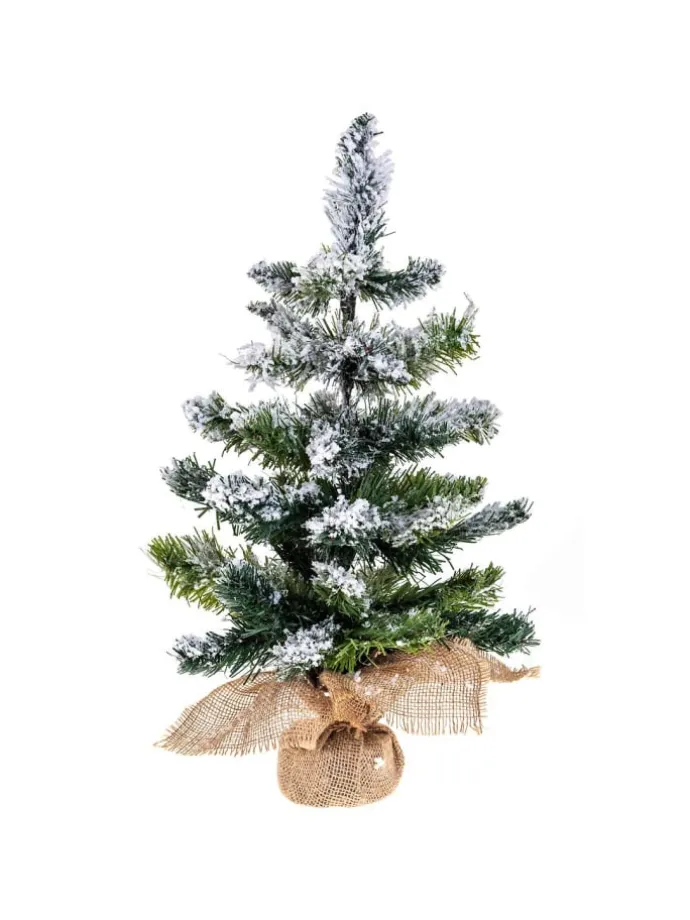 Praktische Dekoration: Künstlicher Weihnachtsbaum, mit Schnee bestäubt, in einem Jutesack, 50 cm hoch, ideal für Innenräume und Außenbereiche.