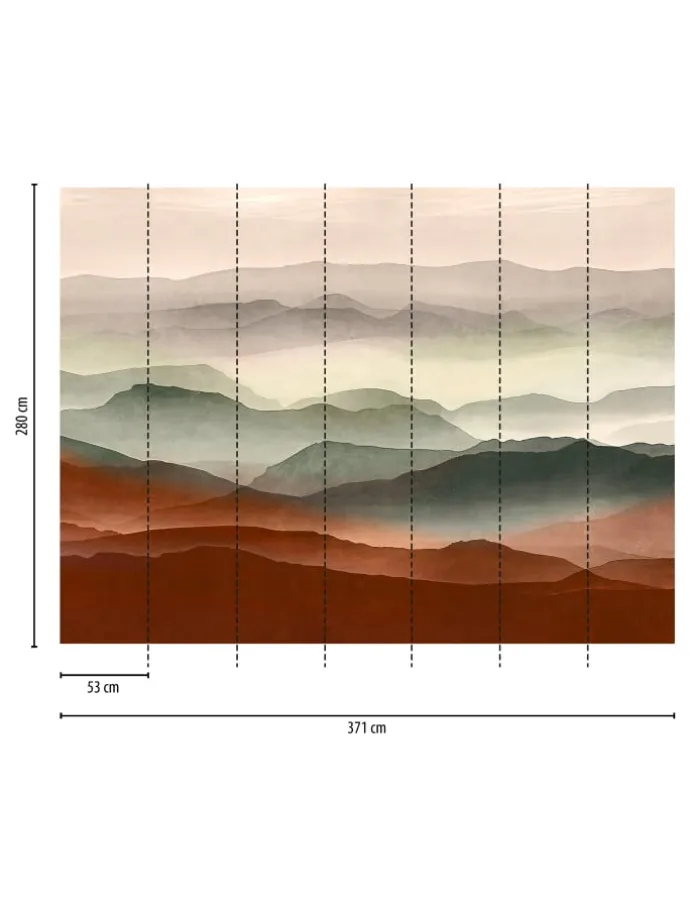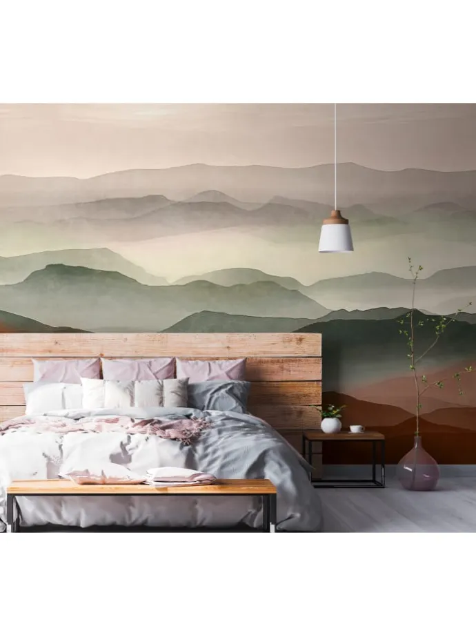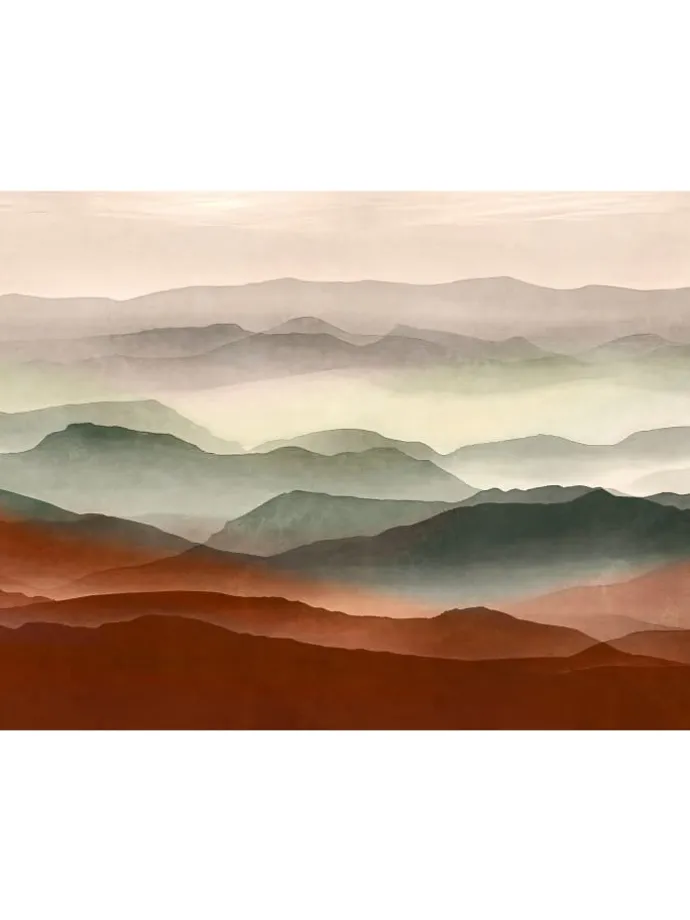 Diese beeindruckende Vliestapete zeigt eine stilisierte Berglandschaft in sanften Aquarellfarben. Die natürlichen Farbverläufe in Grün-, Grau- und Brauntönen vermitteln Ruhe und Weite. Ideal für große Wandflächen – wie geschaffen für ein modernes Wohnambiente.