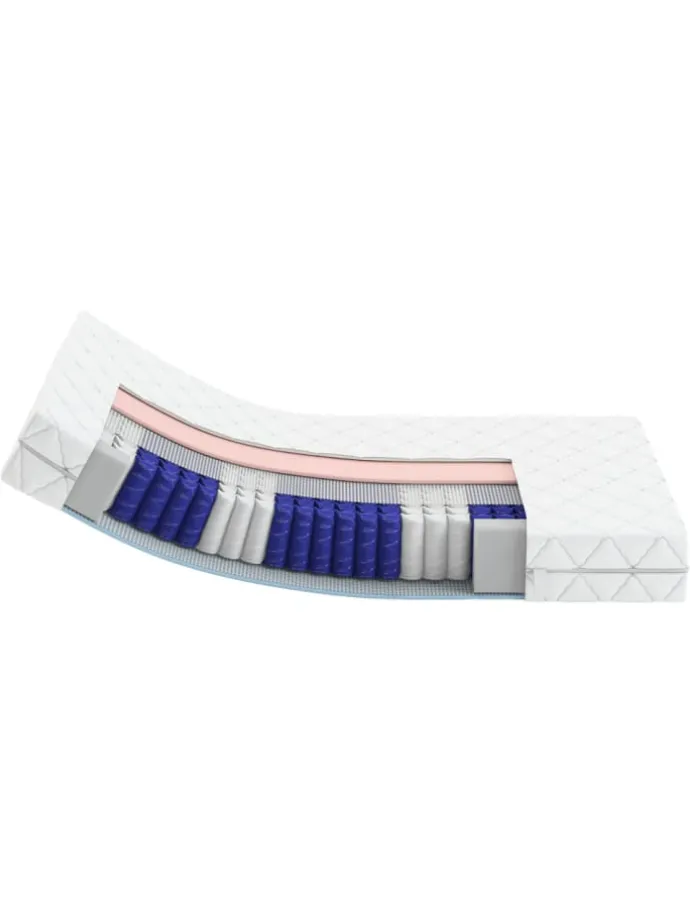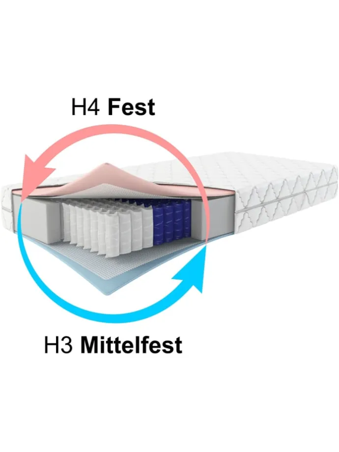 Taschenfederkernmatratze Berlin Plus, , Wendematratze mit 2 Härtegraden H3 und H4. Die Taschenfederkernmatratze BERLIN bietet eine sehr gute Punktelastizit und kann so eine wertvolle Unterstützung der Wirbelsäule im Ruhezustand sein. Das besondere Merkmal der TFK Berlin sind die zwei unterschiedlich festen Seiten. Durch Drehen der Matratze kann so die Härte variiert werden. Auch das Gastgewerbe eine hilfreiche Eigenschaft. Die Liegeflächen sind in einem 7 Zonen Profil angelegt. Die Zonen bieten den Körperpartien die entsprechend benötigte Elastizität. Eine wichtige Entlastung für Schulter, Lenden unde Beckenbereich. Der hochwertige Bezug ist beidseitig mit Klimafaser versteppt. Zusammen mit dem gut gelüfteten Taschenfederkern wird also auch ein ausgezeichnetes Bettklima erreicht. Der Bezug ist abnehmbar und kann bis zu 60°C gewaschen werden. Die Matratze ist insgesamt 24cm hoch. Zwei Härtegrade in einer guten und komfortablen Taschenfederkernmatratze.