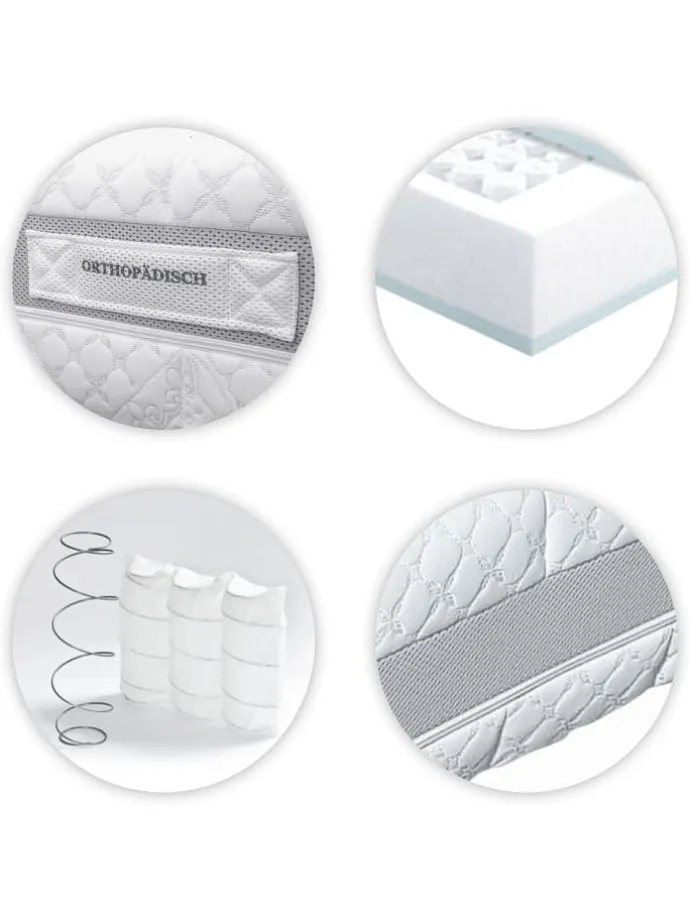 Taschenfederkernmatratze HAMBURG, Härtegrad 2. Die Premium Taschenfederkernmatratze Hamburg beeindruckt mit einem besonderen Liegekomfort. Durch den Einsatz von Tonnenfedern mit unterschiedlicher Härte wird die Liegefläche in 9 ergonomische Zonen eingeteilt. Jeder Körperpartie steht so eine angepasste Einsinktiefe zur Verfügung. Im Ergebnis finden Hals – Brust – und Lendenwirbelsäule in der gewünschten Haltung ihre Ruheposition während des Schlafes. Gleichzeitig sorgen die stärkeren Federn im Rückenbereich für die notwendige Stützung des Körpers. Die Federn in diesem Kern sind in kleine Taschen eingenäht, so dass sie sehr punktelastisch reagieren können und nur dort nachgeben, wo sie belastet werden. Unterstützend für den erholsamen Schlaf wirkt auch die aktive Gestaltung des Bettklimas durch diese Premium Matratze. Der offene Taschenfederkern speichert keine Wärme und ermöglicht eine perfekte Luftzirkulation. Die Matratze ist insgesamt 23cm hoch. Der Bezug ist beidseitig mit einer Klimafaser versteppt und verfügt über ein umlaufendes Klimaband. Dadurch ist er sehr atmungsaktiv und wirkt feuchtigkeitsregulierend. Das Rundum – Klimaband unterstützt das angenehme Bettklima. Die Taschenfederkernmatratze Hamburg ist eine echte Premiummatratze. 9 Komforzonen und ein umlaufendes Klimaband machen Schlafen zum Vergnügen.