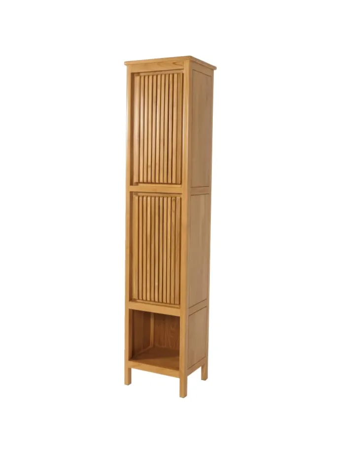 Entdecken Sie den idealen Aufbewahrungsort für Ihr Badezimmer – unseren Teakholz-Hochschrank in elegantem Design, der Funktionalität und Stil meisterhaft vereint. Dieses unverzichtbare Möbelstück wird ohne Dekoration geliefert, sodass Sie sofort mit der persönlichen Gestaltung beginnen können. Jedes der vier großzügigen Staufächer ist mit einer Tür und einem praktischen Einlegeboden ausgestattet, was Ihnen ermöglicht, Handtücher, Pflegeprodukte und weitere Badezimmerutensilien ordentlich und griffbereit zu verstauen.