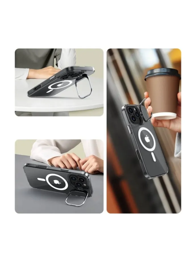 Die MagStand Magnet-Hülle schützt das iPhone 16 Pro mit integrierter Stützfunktion für komfortables Aufstellen des Smartphones.