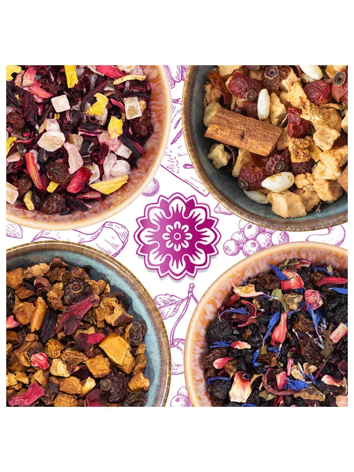 Zutaten (Beerensextett): Weinbeeren, Hagebuttenschalen, Apfelstücke, Hibiskusblüten, Brombeeren, Schwarze Johannisbeeren, Heidelbeeren, Aroma, Rote Bete-Stücke, Beerenblätter (Brombeerblätter, Schwarze Johannisbeerblätter), Schlehenfrüchte