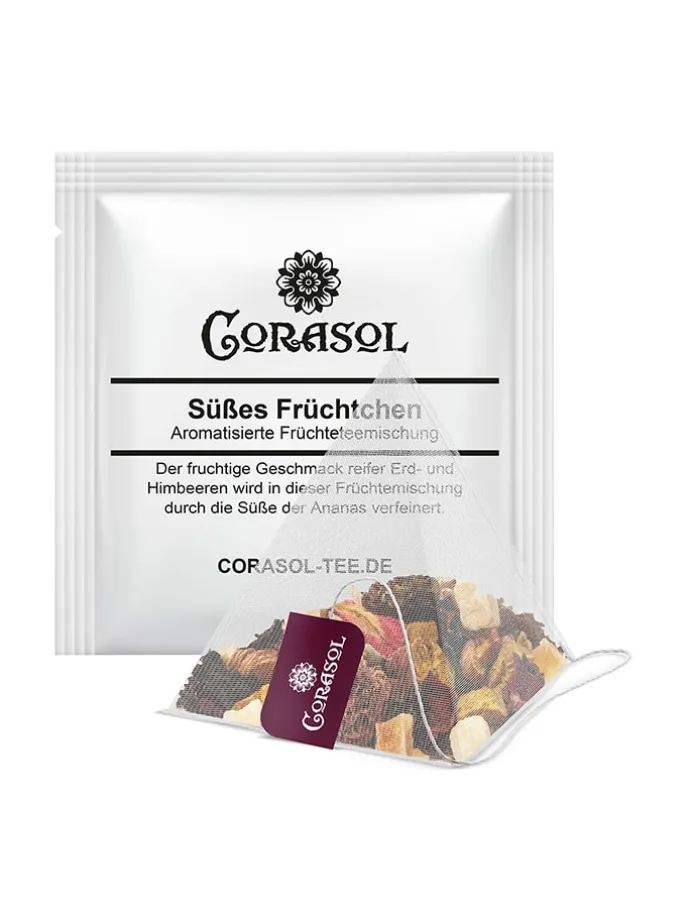 Zutaten (Süßes Früchtchen): Hibiskusblüten, Apfelstücke, Weinbeeren, Papayastücke (Papaya, Zucker, Säuerungsmittel: Zitronensäure), Ananasstücke (Ananas, Zucker, Säuerungsmittel: Zitronensäure), Hagebuttenschalen, Kirschen, Aroma, Himbeeren.