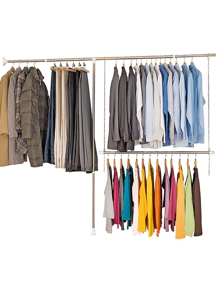 – eine zweite Garderobenstange kann durch verstellbare Ketten auf die gewünschte Höhe abgehängt werden