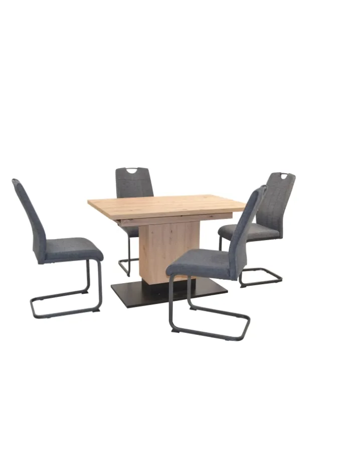 Moderne 5tlg. Sitzgruppe bestehend aus einem Säulen-Esstisch mit Auszugsfunktion und 4 hochwertigen Schwingstühlen. Der moderner Esstisch ist komplett aus Holzwerkstoff gefertigt und mit einem pflegeleichten Melamin-Holzdekor, Artisan-Eiche-Nachbildung, beschichtet. Stabiles Säulengestell, Bodenplatte uni schwarz. Die Tischplatte ist in der Mitte geteilt und lässt sich schnell und einfach dank der zwei Metall-Synchronauszügen auseinander ziehen. Darunter befinden sich zwei eingelegte Erweiterungsplatten (je ca. 30 cm breit), dadurch lässt sich die Tischplatte von 120 cm bis auf 180 cm vergrößern. Die 4 Stühle haben ein schwarzes Stahlrohrgestell, Sitz und Rücken sind bequem schaumstoffgepolstert und mit einem attraktiven Stoffbezug (100% Polyester), wahlweise in grau, grün oder bordeauxfarben bezogen. Esstisch und Stühle werden zur Selbstmonage, inklusive Aufbauanleitung angeliefert. Maße ca. cm: Esstisch (B/H/T) 120-180/76/80 // Stühle (B/H/T) 44/99/61. Sitzöhe ca. 47 cm. Sitztiefe ca. 43 cm
