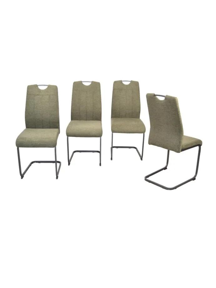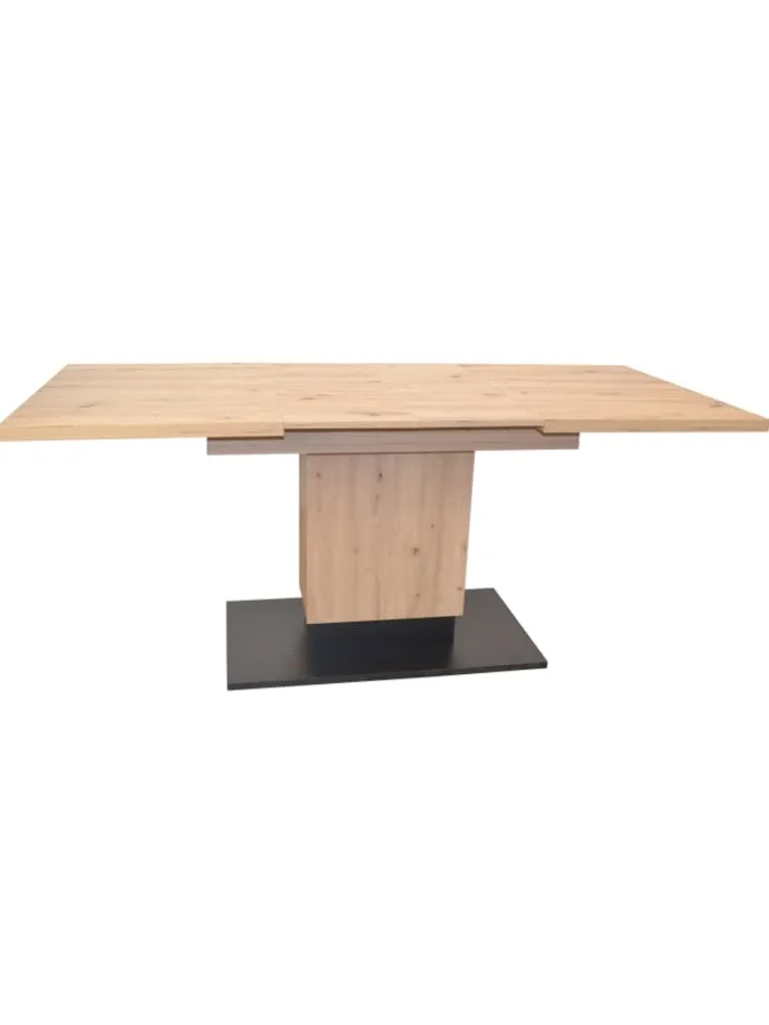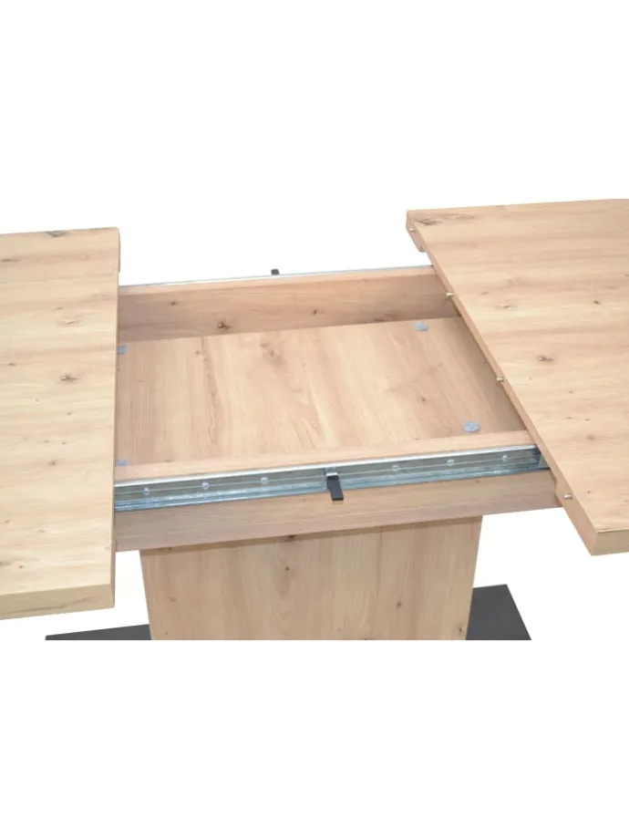 Moderne 5tlg. Sitzgruppe bestehend aus einem Säulen-Esstisch mit Auszugsfunktion und 4 hochwertigen Schwingstühlen. Der moderner Esstisch ist komplett aus Holzwerkstoff gefertigt und mit einem pflegeleichten Melamin-Holzdekor, Artisan-Eiche-Nachbildung, beschichtet. Stabiles Säulengestell, Bodenplatte uni schwarz. Die Tischplatte ist in der Mitte geteilt und lässt sich schnell und einfach dank der zwei Metall-Synchronauszügen auseinander ziehen. Darunter befinden sich zwei eingelegte Erweiterungsplatten (je ca. 30 cm breit), dadurch lässt sich die Tischplatte von 120 cm bis auf 180 cm vergrößern. Die 4 Stühle haben ein schwarzes Stahlrohrgestell, Sitz und Rücken sind bequem schaumstoffgepolstert und mit einem attraktiven Stoffbezug (100% Polyester), wahlweise in grau, grün oder bordeauxfarben bezogen. Esstisch und Stühle werden zur Selbstmonage, inklusive Aufbauanleitung angeliefert. Maße ca. cm: Esstisch (B/H/T) 120-180/76/80 // Stühle (B/H/T) 44/99/61. Sitzöhe ca. 47 cm. Sitztiefe ca. 43 cm