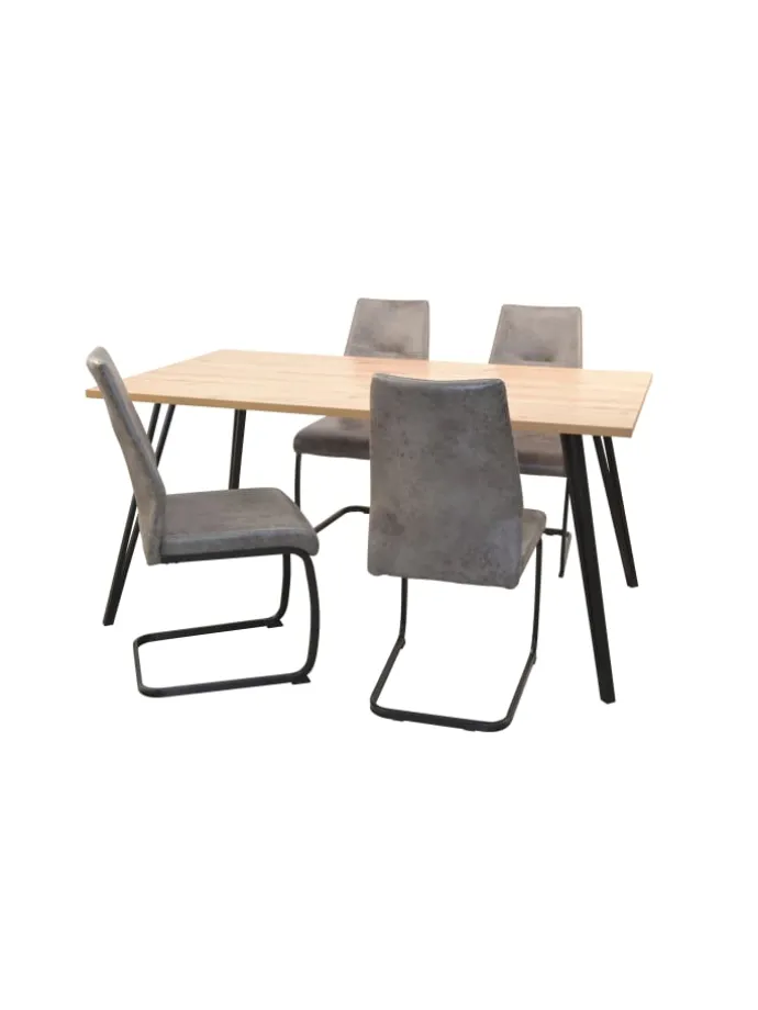 Moderne 5tlg. Sitzgruppe bestehend aus einem Esstisch 160×90 cm und vier hochwertigen Schwingstühlen. Esstisch mit 4 Metallbeinen, schwarz beschichtet. Die Tischplatte aus Holzwerkstoff ist ca. 160×90 cm und mit einem pflegeleichten Melmaindekor, beschichtet. Die Stühle haben ebenfalls ein schwarzes Metallgestell, Sitz und Rücken sind bequem schaumstoffgepolstert und mit einem Mikrofaser-Stoffbezug (100% Polyester) im Vintage-Look, grau, bezogen. Esstisch und Stühle werden zur Selbstmonage, inklusive Aufbauanleitung angeliefert. Maße ca. cm: Esstisch (B/H/T) 160/76/90 // Stühle (B/H/T) 43/92/59. Sitzöhe ca. 47 cm.