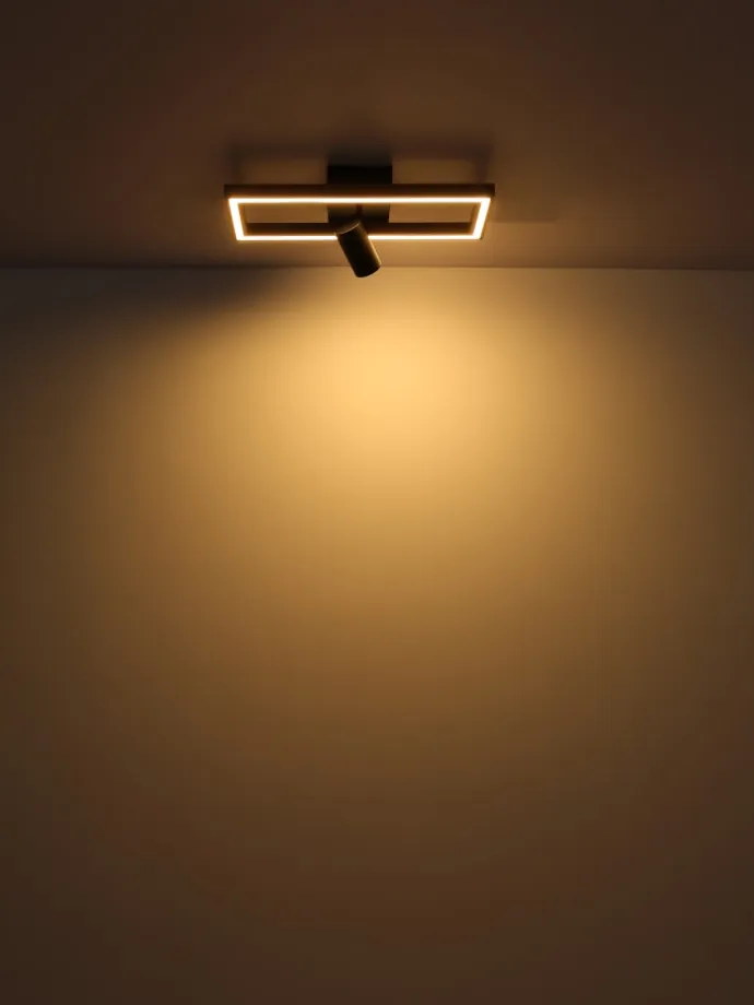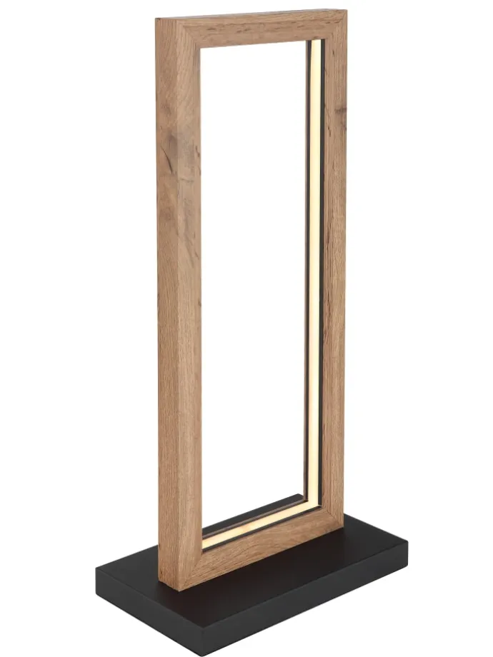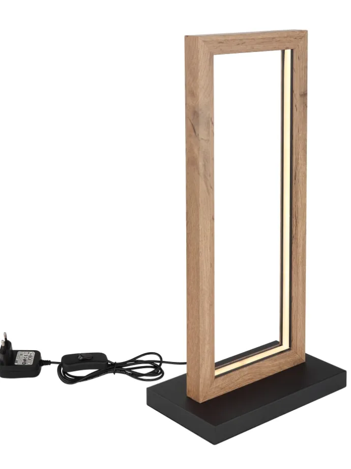 Tischleuchte Metall schwarz matt, MDF holzoptik dunkel, Kunststoff opal, Kabel PVC Schwarz, Wippschalter am Kabel, LxBxH: 250x150x525mm, Kabellänge 1500mm, inkl. LED 12W 230V, 1380lm Source, 450lm Output, 3000K