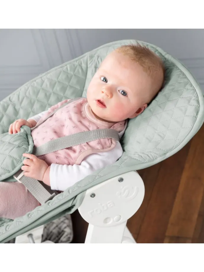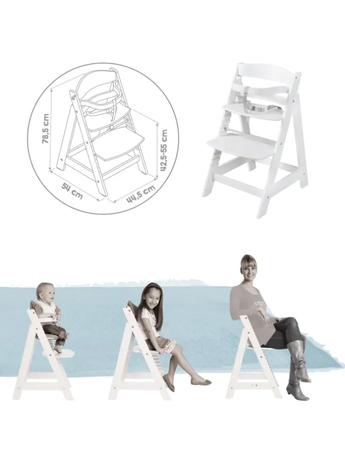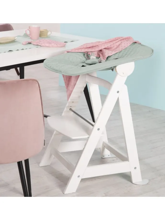 Der roba Treppenhochstuhl Born Up im modernen Design „roba Style“ frosty green wird in einem Komplett-Set mit Treppenhochstuhl und inkl. verstellbarem Aufsatz geliefert. Der Hochstuhl mit Aufsatz für Ihren Säugling ist von 0 bis 6 Monate und bis zu 9 kg geeignet. Ohne den Aufsatz ist der Stuhl der ideale Begleiter Ihres Kindes bis ins Jugendalter und bis zu max. 50 kg belastbar. Das 2in1 Set besteht aus einem mitwachsenden, weißen Treppenhochstuhl aus Holz und einem verstellbaren Aufsatz, in dem Ihr Baby bequem und sicher liegt. Der Aufsatz lässt sich per Knopfdruck in eine Schlaf- und eine Fütterposition verstellen. Der Hochstuhl mit 3-Punkt-Gurtsystem bietet Ihrem Kind bis ins Jugendalter ergonomischen, sicheren und angepassten Sitzkomfort. Der Babyhochstuhl mit Liegefunktion mit 5-Punkt-Gurtsystem bietet ab der Geburt eine lange Nutzungs- und Lebensdauer. Für Kleinkinder ist die oberste Ebene des Born Up Hochstuhls vorgesehen. Nach einfacher Abnahme von Schutzbügel und Gurtsystem wächst der Treppenhochstuhl stufenweise – unterstützt durch das höhenvariable und herausnehmbare Sitz- bzw. Fußbrett – zum Jugendstuhl heran. Die hochwertigen, modernen roba style Produkte sind mit Textilien aus pflegeleichter, gesteppter Mikrofaser ausgestattet. Sie überzeugen durch ihre zeitgemäße Optik, die sich in jedes Wohn- und Babyzimmer integriert und ihre weiche Haptik. Entdecken Sie weitere praktische Baby-Artikel aus der roba Style Serie wie z.B.: Krabbeldecken, Babylounges, Sicherheitswickelauflagen, Laufgittereinlagen und vieles mehr. Der Hochstuhl mit 3-Punkt-Gurtsystem wurde nach der aktuellen Norm DIN EN 14988:2017 in Deutschland entwickelt. Der Aufsatz mit 5-Punkt-Gurtsystem wurde kippsicher nach der aktuellen Norm EN 12790:2009 in Deutschland entwickelt. Alle verwendeten Materialien sind schadstoffgeprüft und zertifiziert. Material: Formholz und Schichtholz. Hochstuhl (ohne Aufsatz): LxBxH: 44,5x54x80 cm. Sitzhöhe max. 55 cm, min. 42 cm. Bezug bei 40° C waschbar. Farbe: Weiß.