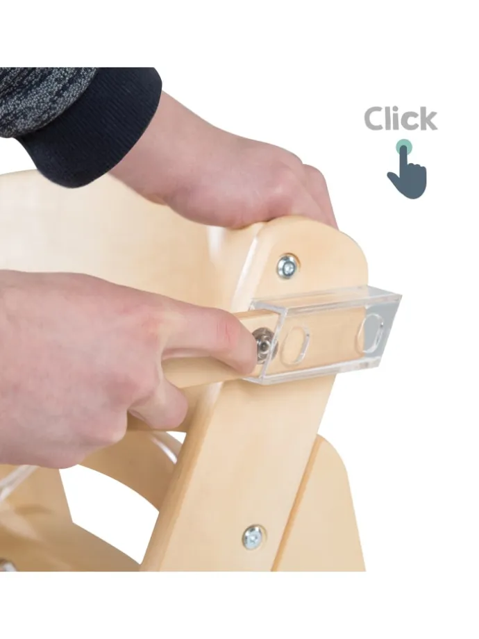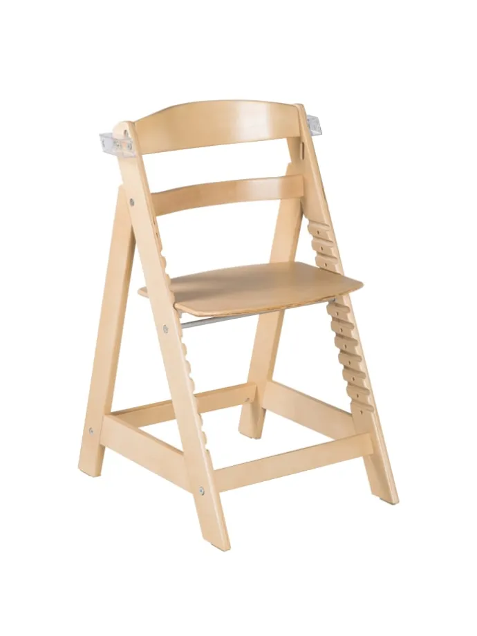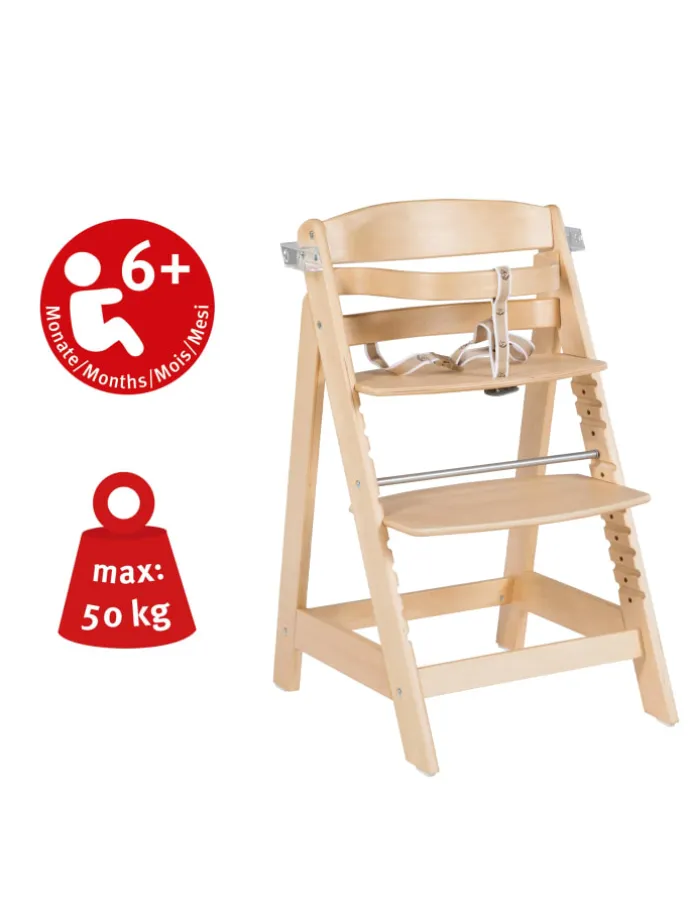 Der roba Treppenhochstuhl ‘Sit Up Click & Fun’ ist ein sicherer und mitwachsender Hochstuhl mit abnehmbarem Essbrett und zusätzlichem Schutzbügel für die Verwendung ohne Essbrett. Durch ein Klicksystem ist das Essbrett kinderleicht und ohne Montage einsetzbar oder in der Größe verstellbar. Die Sitz- und Fußplatten des Kinderstuhles lassen sich für eine ergonomisch richtige Sitzeinstellung dank des innovativen Klickverschlusses leicht in Höhe und Tiefe verstellen und an die jeweilige Wachstumsphase Ihres Kindes anpassen. Der Kinderhochstuhl bietet eine optimale Unterstützung des Rückens und der richtigen Sitzhaltung unabhängig von der Größe des Kindes. Der stabile Hochstuhl aus Holz hat durch seine spezielle Konstruktion eine hohe Kippsicherheit. Der abnehmbare Sicherheitsbügel und das Gurtsystem bieten zusätzlichen Schutz im Kleinkindalter. Der Treppenhochstuhl ist für verschiedene Tischhöhen geeignet und von Esstisch bis zum Kinderschreibtisch flexibel anpassbar. Als Babyhochstuhl für Kleinkinder geeignet, die ohne fremde Hilfe sitzen können (ab ca. 6 Monaten), und als Kinderstuhl bis ca. 50 kg belastbar. Die Sitzhöhe des Hochstuhls liegt bei maximal 54,5 cm, die unterste Einstellung liegt bei 45 cm. Grundmaße: 80 cm x 44,5 cm x 54 cm (HxBxT), Oberkante Bügel 71 cm. Die einfache Montage des Hochstuhls dauert ca. 30 Minuten. Sitz- und Fußbrett können nach Belieben in die jeweiligen Einschübe mit einem Handgriff geschoben werden. Zum Reinigen kann man den Treppenhochstuhl mit einem feuchten Tuch abwischen. Der roba Treppenhochstuhl ‘Sit Up Click’n’Fun’ ist in verschiedenen Farben und Ausführungen erhältlich: natur, weiß oder taupe. Damit Kinder und Babys in den ersten Lebensmonaten perfekt im Hochstuhl sitzen können, ist optional dazu ein zweiteiliger Sitzverkleinerer in verschiedenen Farben und Designs erhältlich (Art.-Nr. 1852 und 318052) Der mitwachsende Hochstuhl ‘Sit Up Click’n’Fun’ ist nach den aktuellsten Sicherheitsstandards nach Norm EN 14988: 2017 entwickelt und produziert. Alle verwendeten Materialien sind zertifiziert und werden regelmäßig geprüft. Der verwendete Lack ist hautverträglich.