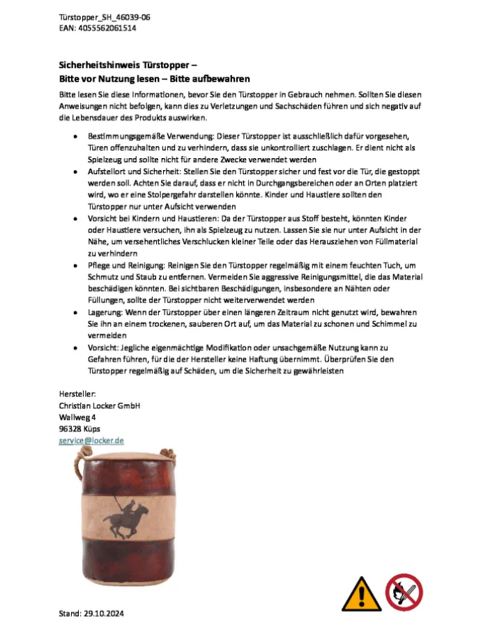 Nie wieder zuschlagende Türen dank dieses praktischen Türstoppers in einem rustikalem Design von kobolo. Der Türstopper kann dank des großen Griffes an der Oberseite schnell und einfach versetzt werden. Durch die Materialwahl entstehen auf dem Boden und an den Türen keine Kratzer. 90 Prozent Baumwolle und 10 Prozent Leder, Füllung 50 Prozent Baumwolle und 50 Prozent Sand – Gewicht ca 2 kg.