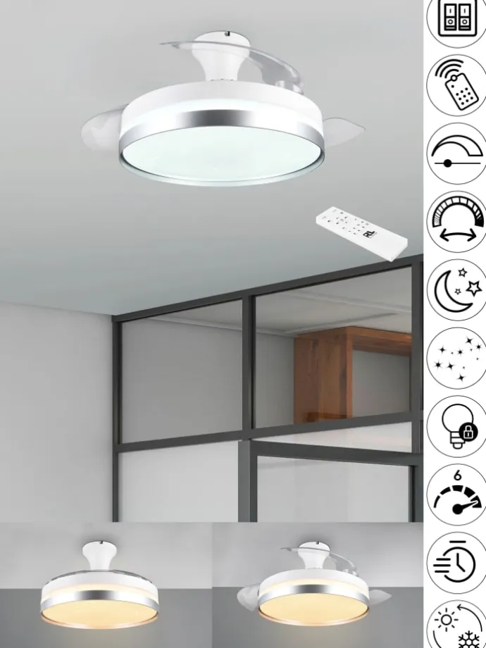 Die Deckenleuchte LINDBERG bietet mit ihrer Ventilatorfunktion eine 2-in-1-Lösung! Mit der beiliegenden Fernebdienung können Sie bequem aus der Ferne die Lichtintensität sowie die Lichtfarbe stufenlos an Ihre Bedürfnisse anpassen. Wenn Sie jedoch mehr als nur Licht benötigen, lassen sich die Ventilatorflügel der LINDBERG auf Knopfdruck ausklappen. Die drei Geschwindigkeitsstufen des Ventilators sorgen sowohl im Sommer als auch im Winter für eine optimale und ausgeglichene Raumluft in Ihren Wohn- und Schlafräumen. Die zahlreichen Funktionen der Leuchte werden durch den integrierten Timer, die Nachtlicht- und Memory-Funktion perfekt abgerundet. Die Farbgestaltung in Weiß matt und Titanfarbig harmoniertn mühelos mit jedem Einrichtungsstil. Darüber hinaus verfügt die Leuchte über eine moderne LED Technologie, die sich durch eine hohe Lichtqualität und Energieeffizienz auszeichnet. Im Vergleich zu herkömmlichen Halogen Leuchtmitteln lassen sich bis zu 80% der Energiekosten sparen. Zusätzlich profitieren Sie bei LED Leuchtmitteln von einer langen Lebensdauer, einer geringen Wärmeentwicklung und schonen gleichzeitig die Umwelt.