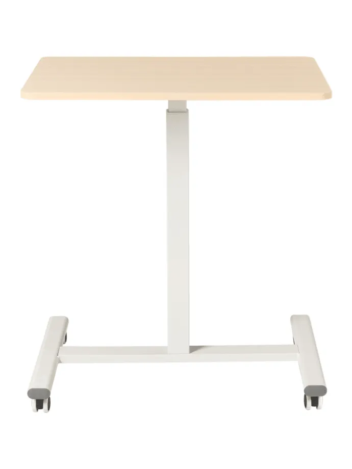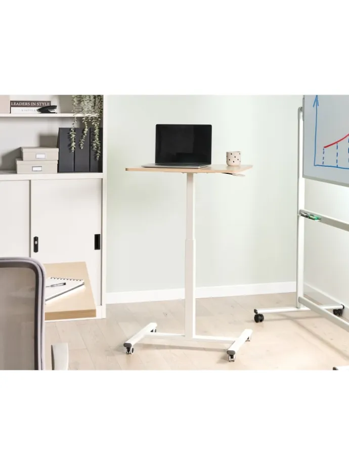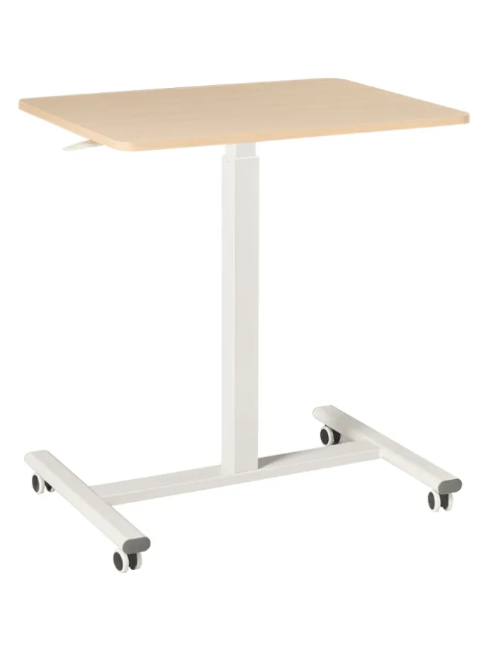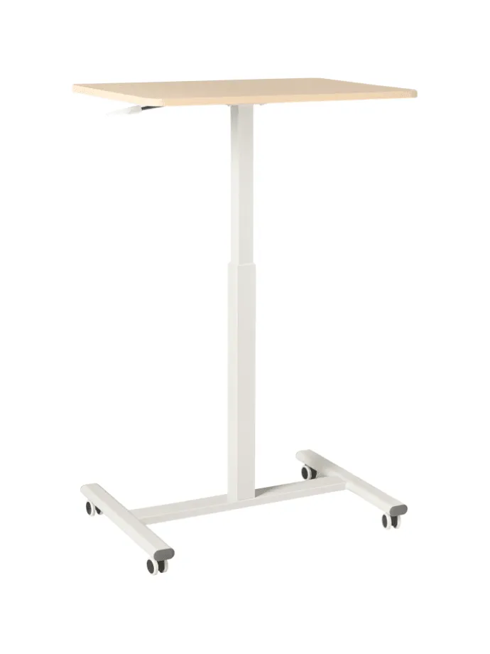 Manuell höhenverstellbarer Laptophalter in heller Holzoptik und Weiß. Vereinfachen Sie Ihren Arbeitsalltag mit diesem kompakten, höhenverstellbaren Laptoptisch. Er verfügt über eine elegante Tischplatte in heller Holzoptik und einen stabilen weißen Metallrahmen. Die verstellbare Höhe ermöglicht ein müheloses Wechseln zwischen Sitzen und Stehen, während die Rollen für ein einfaches Verschieben sorgen. Eine moderne, platzsparende Lösung für einen flexiblen und ergonomischen Arbeitsplatz – ideal, um Funktionalität und Stil in Ihrem Homeoffice zu vereinen.