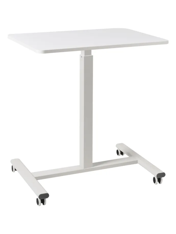 Manuell höhenverstellbarer Laptophalter in Weiß. Vereinfachen Sie Ihren Arbeitsalltag mit diesem kompakten, höhenverstellbaren Laptoptisch. Er verfügt über eine elegante, weiße Tischplatte und einen stabilen, passenden Metallrahmen. Die verstellbare Höhe ermöglicht ein müheloses Wechseln zwischen Sitzen und Stehen, während die Rollen für ein einfaches Verschieben sorgen. Eine moderne, platzsparende Lösung für einen flexiblen und ergonomischen Arbeitsplatz – ideal, um Funktionalität und Stil in Ihrem Homeoffice zu vereinen.