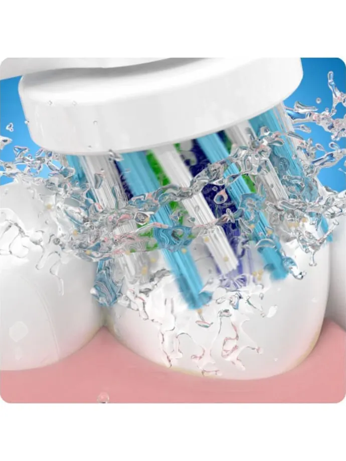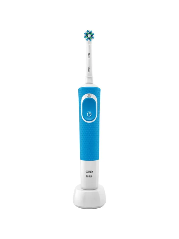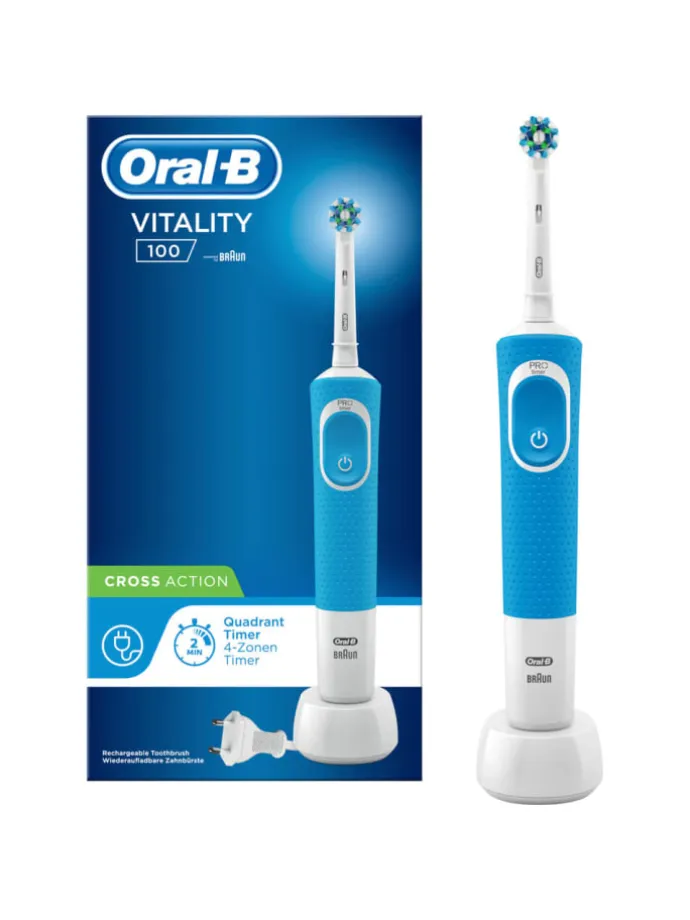 Die Oral-B Vitality 100 CrossAction wiederaufladbare elektrische Zahnbürste bietet eine klinisch erwiesene, überlegene Reinigung im Vergleich zu einer herkömmlichen Handzahnbürste und eignet sich somit als ideales Einstiegsmodell in die elektrische Zahnpflege. Der professionelle CrossAction Bürstenkopf umschließt jeden Zahn mit seinen um 16 Grad angewinkelten Borsten, während mithilfe der 2D-Reinigungstechnologie durch oszillierende und rotierende Bewegungen Plaque besser entfernt wird als mit einer herkömmlichen Handzahnbürste.