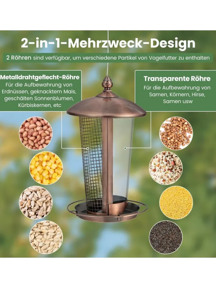 Unser 2-in-1-Vogelfutterhaus zum Aufhängen im Freien wird mit 2 Röhren geliefert, die Samen unterschiedlicher Größe aufnehmen können, um Vögel wie Kardinäle, Spottdrosseln, Meisen, Stieglitze, Drosseln usw. anzulocken. Außerdem besteht es aus hochfestem, gespritztem Metall und durch die Verwendung eines rostfreien Edelstahldrahts kann der Futterspender für Wildvögel bei unterschiedlichem Wetter verwendet werden. Und mit dem erhöhten runden Tablett können mehrere Vögel gleichzeitig ihr Futter genießen. Wenn es leer ist, müssen Sie nur noch den Deckel öffnen und neues Saatgut nachfüllen. Sie können ihn je nach Bedarf an den Baum, die Traufe oder eine Säule hängen.