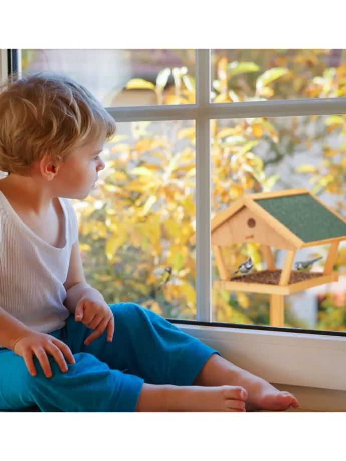 Das Futterhäuschen aus natürlichem Tannenholz kann auf Terrasse oder im Garten dank seines Standfußes ganz einfach aufgestellt werden. Füllen Sie ganzjährig Vogelfutter in die Futterstelle und locken Sie damit heimische Vögel wie Meisen, Amseln und Rotkehlchen an. Die Vogelfutterstation ist eine tolle Beobachtungsmöglichkeit – besonders für Kinder. Das Design des Vogelhauses mit grünem Dach fügt sich dabei harmonisch in die Natur ein.