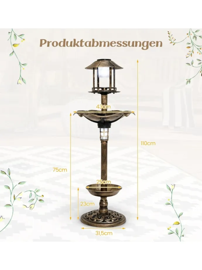 Unser Solar-Vogelbad für den Außenbereich kann nicht nur als funktionelles Vogelbad und Vogelhäuschen dienen, sondern bietet auch Lichter, um Ihren Garten oder Hof nachts zu beleuchten. Es gibt ein abnehmbares Solarpanel auf der Oberseite und ein integriertes Solarpanel auf der Vogeltränkeschale, das sich bei Tageslicht für den abendlichen Gebrauch automatisch aufladen kann, was die Energieeffizienz fördert. Darüber hinaus verfügt es über eine breite Lilienblattschale, die den Vögeln einen erfrischenden Platz zum Trinken und Baden bietet, während der Vogelfutterspender mit seiner Schutzhülle dafür sorgt, dass die Samen auch bei Nässe trocken bleiben.