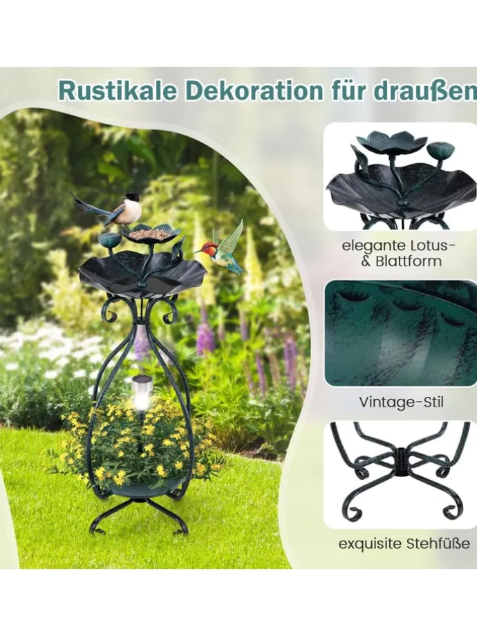 Exquisite Standfüße verleihen der Metallvogeltränke Vintage-Stil