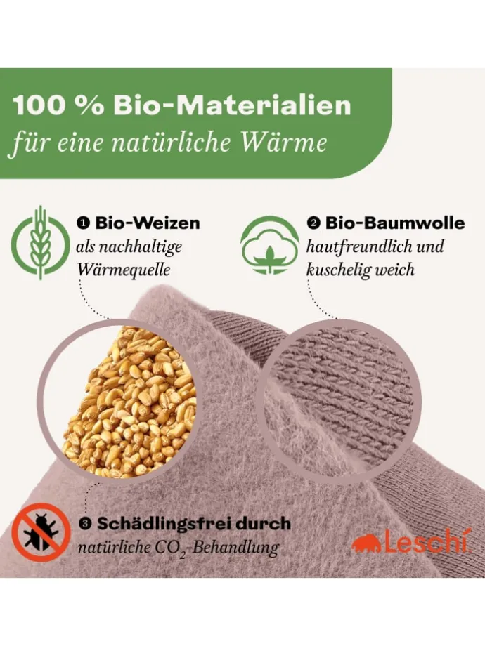 • Füllmaterial (Wärmespeicher): 100% Bio-Weizen (naturbelassen, 100% schädlingsfrei durch natürliche CO2-Behandlung)