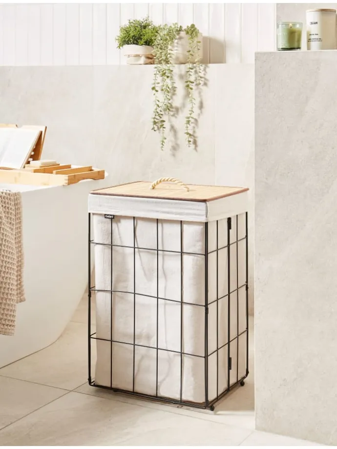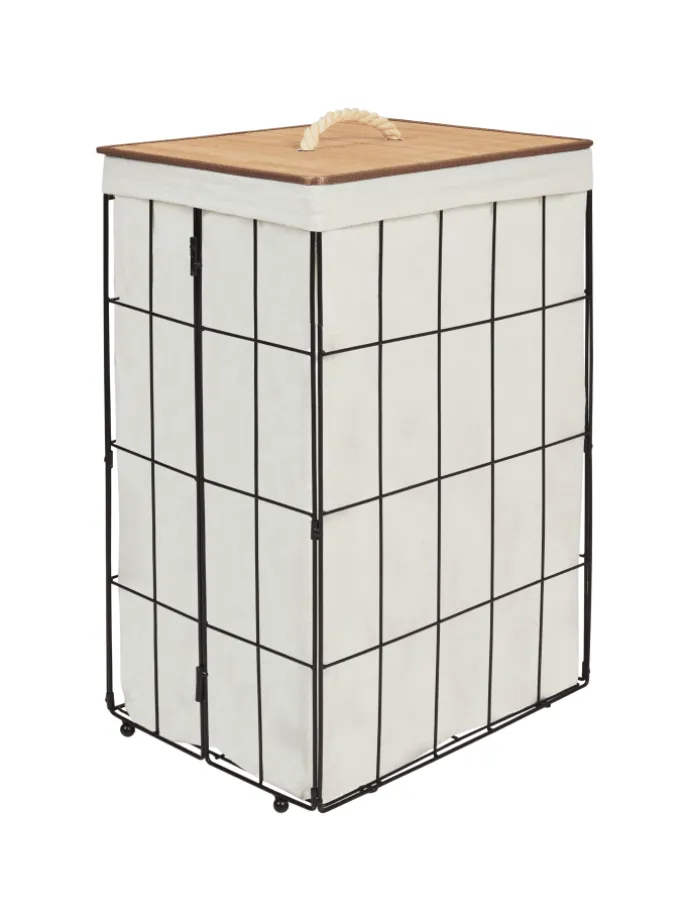 Badezimmer Wäschekorb mit Deckel und Wäschesack. Dieser elegante Wäschekorb verbindet Funktionalität mit minimalistischem Design. Er besteht aus robustem Metall und ist innen mit Stoff gefüttert, der die Wäsche optimal durchlüftet. Der Bambusdeckel verleiht dem Korb einen natürlichen Touch und ist abnehmbar, so dass man leicht darauf zugreifen und ihn reinigen kann. Dieser Korb ist ideal für moderne Badezimmer oder Waschküchen und vereint auf einfache Weise Haltbarkeit und Eleganz.