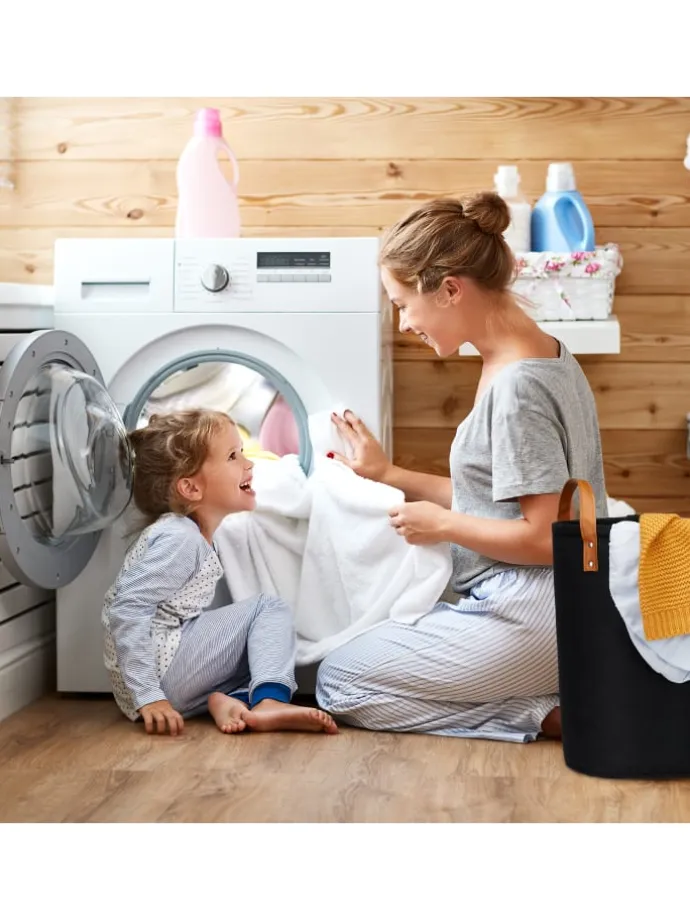 Der Wäschekorb eignet sich ideal, wenn sich bei Ihnen Zuhause Wäsche in verschiedenen Räumen ansammelt. Dank der Henkel in Lederoptik können Sie den Wäschesammler mit Inhalt problemlos zur Waschmaschine und zurück tragen – Herunterfallende Kleidungsstücke von Klamottenbergen sind so kein Problem mehr. Das moderne Design des Filzkorbs ist auch ideal, wenn Sie diesen zur Aufbewahrung nutzen wollen – Spielzeug und Kuscheltiere oder Kissen und Decken für das Wohnzimmer finden hier Ihren Platz.