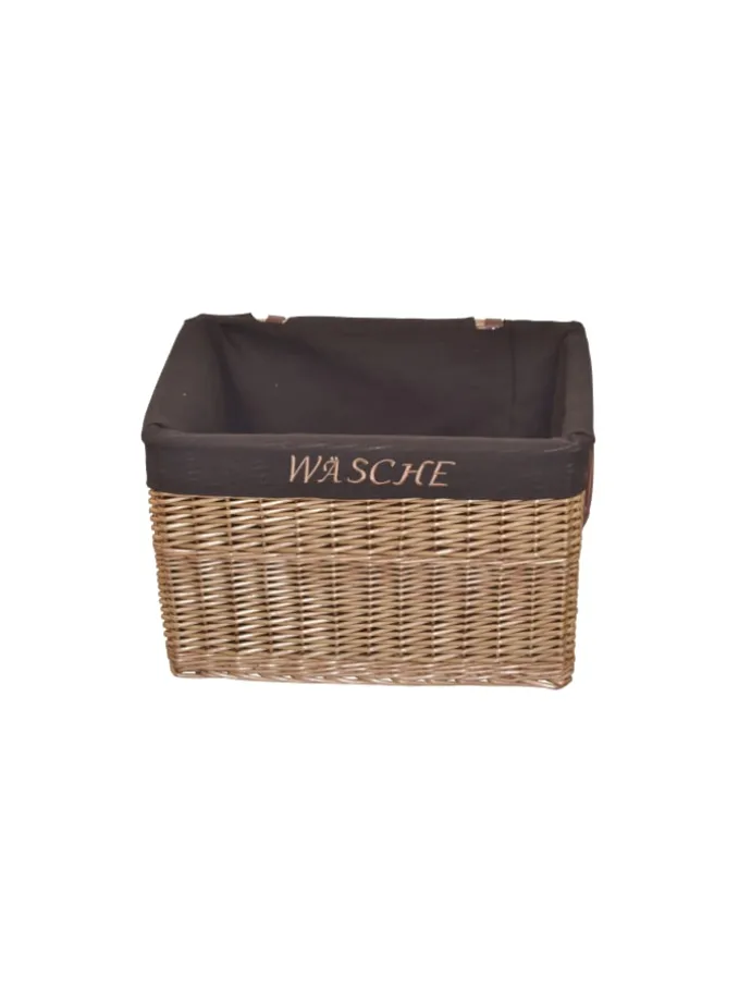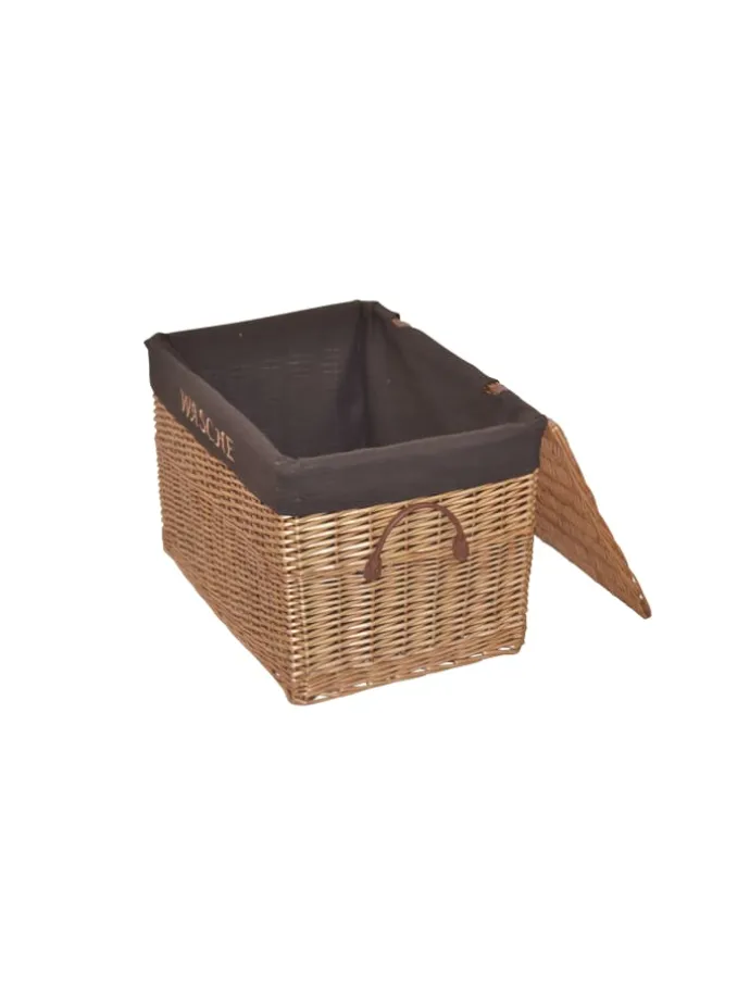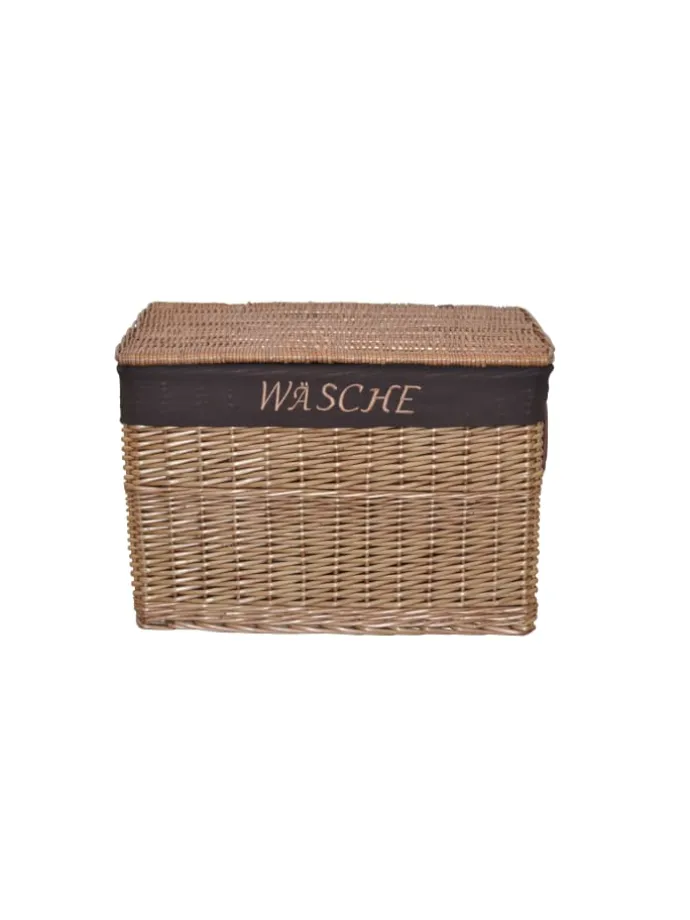 Praktischer Wäschekorb komplett aus Weide, handgeflochten. Mit praktischen aufklappbaren Deckel, innen mit einem Stoffeinsatz (100% Polyester) ausgestattet, der mit dem Schriftzug „WÄSCHE“ bestickt ist. Rechts/links je ein Kunstledergriff (100% Polyvinylchlorid) angebracht. Lieferung der Wäschekörbe erfolgt montiert. Maße ca. cm: (B/H/T) 60/41/42. Lieferbar in zwei trendigen Farben.