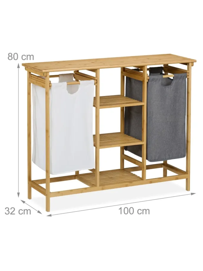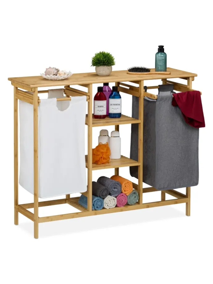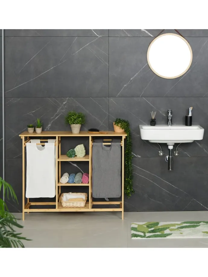 Verstaue Deine Schmutzwäsche ordentlich bis zum nächsten Waschgang. Zwei ausziehbare Wäschekörbe ermöglichen das diskrete Aufbewahren und Vorsortieren Deiner Schmutzwäsche. Gleichzeitig wird Dir durch die eine große und 3 kleine Ablagen zusätzlicher Stauraum für Handtücher, Waschmittel und mehr geboten. Das moderne Design und der Materialmix aus Bambus und Stoff-Wäschesäcken machen die praktische Kombination aus Wäschesortierer und Badregal zum Hingucker in Deinem Schlaf- oder Badezimmer.
