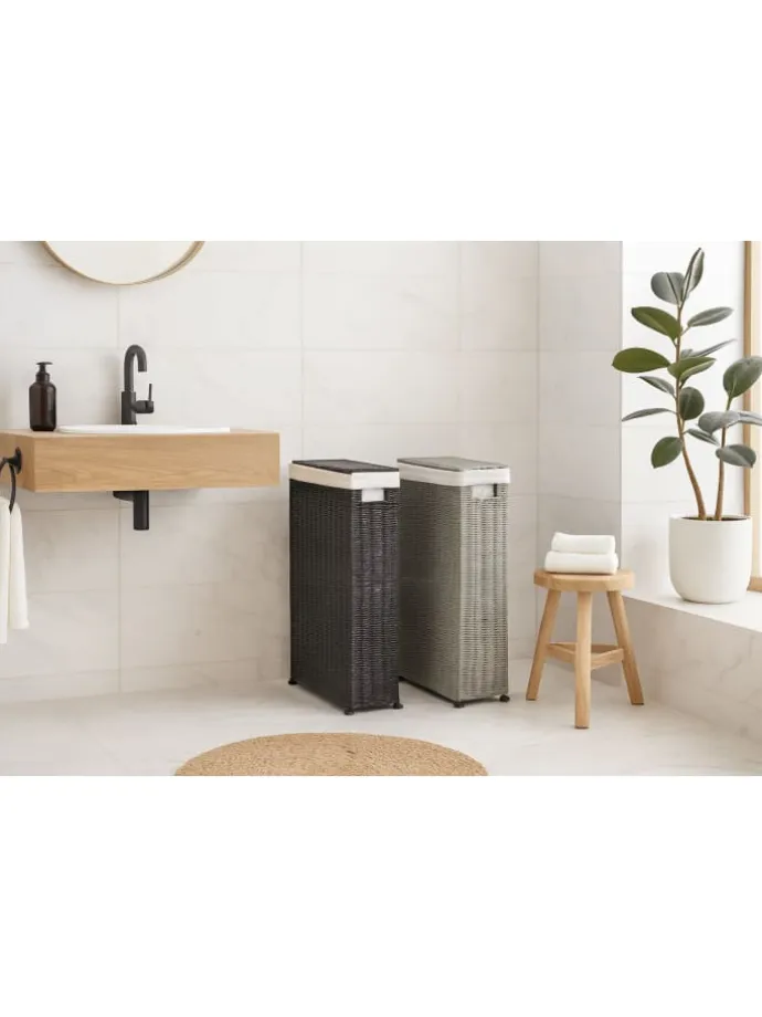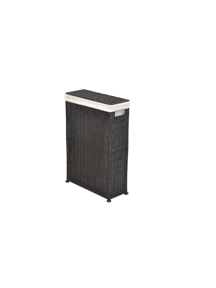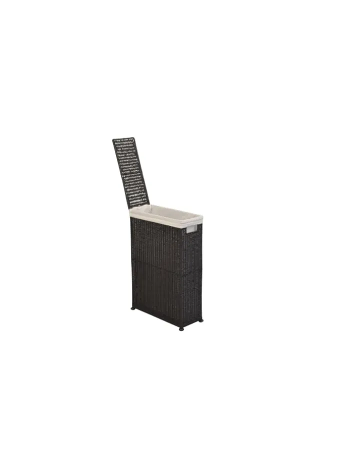 Hochwertiger Wäschesammler aus Rattangeflecht, handgeflochten, farbig lackiert. Stabiles Gestell aus Eisen, unten mit schwarzen Kunststofffüßen. Deckel aufklappbar, darunter Stauraum, der mit einem cremefarbenen Stoffeinsatz (35% Polyester/65% Baumwolle) bestückt ist. Vorne mit einem praktischen eingearbeiteten Griff. Der Wäschesammler wird montiert angeliefert. Maße ca. cm: (B/H/T) 16/59/39. Ideal für kleine, schmale Nischen.