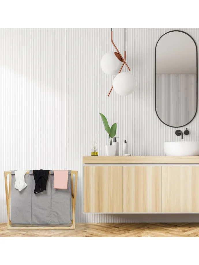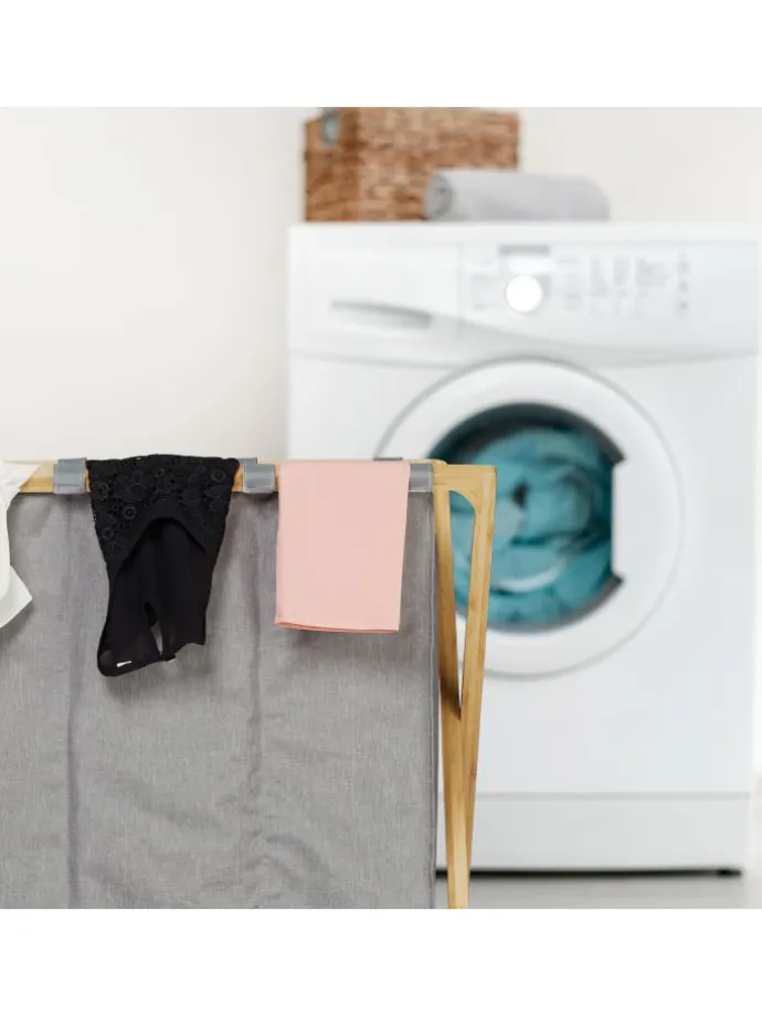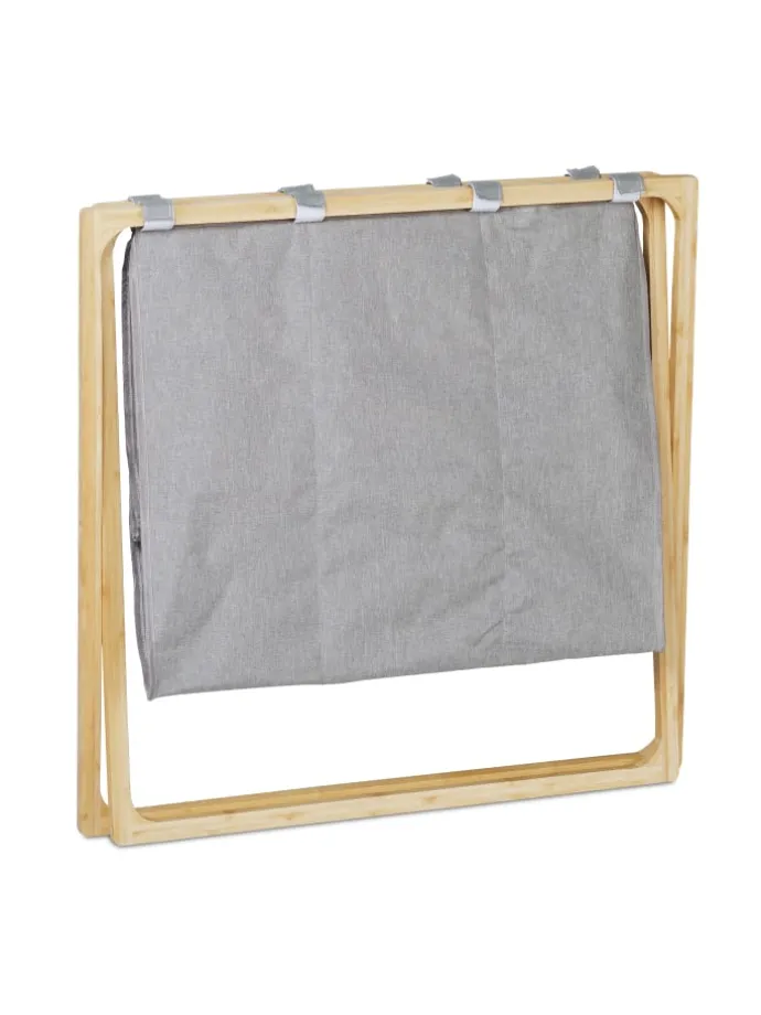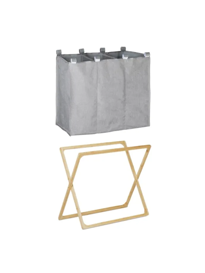 Mit dem modernen Wäschesammler holen Sie sich ein praktisches und zugleich dekoratives Accessoire in Ihr Zuhause. Der Wäschesortierer ist in 3 Kammern aufgeteilt. So haben Sie stets den Überblick über Ihre Wäsche und können bequem nach Farben oder Art der Kleidung sortieren. Bei Bedarf kann der Wäschetrenner zusammengeklappt und verstaut werden. Der Materialmix aus der grauen Stofftasche und dem Gestell aus natürlichem Bambus macht den Wäschekorb zum Hingucker im Schlaf- oder Badezimmer.