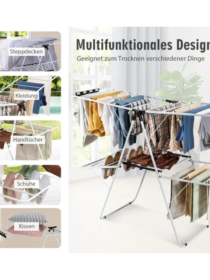 Unser faltbarer Wäscheständer ist Ihr Helfer beim Trocknen einer Vielzahl von Kleidungsstücken und anderen Gegenständen! Das fertig montierte Gestell ist einfach zu bedienen. Dank der verstellbaren Flügel und dem großzügigen Trockenraum können Sie längere Kleidungsstücke oder Bettwäsche bequem aufhängen. Außerdem verhindert die Dreiecksstruktur, dass er zusammenbricht oder sich verformt. Unser Wäscheständer aus robustem Stahl ist sowohl für den Innen- als auch für den Außenbereich geeignet. Sie können ihn auch als Lagerregal in Ihrem Schlafzimmer oder Wohnzimmer verwenden. Der Wäscheständer kann auch zum Trocknen von Bettdecken, Kissen und Schuhen auf Ihrem Balkon, im Garten und an anderen Orten verwendet werden. Darüber hinaus können Sie ihn nach Gebrauch zusammenklappen und überall aufbewahren.