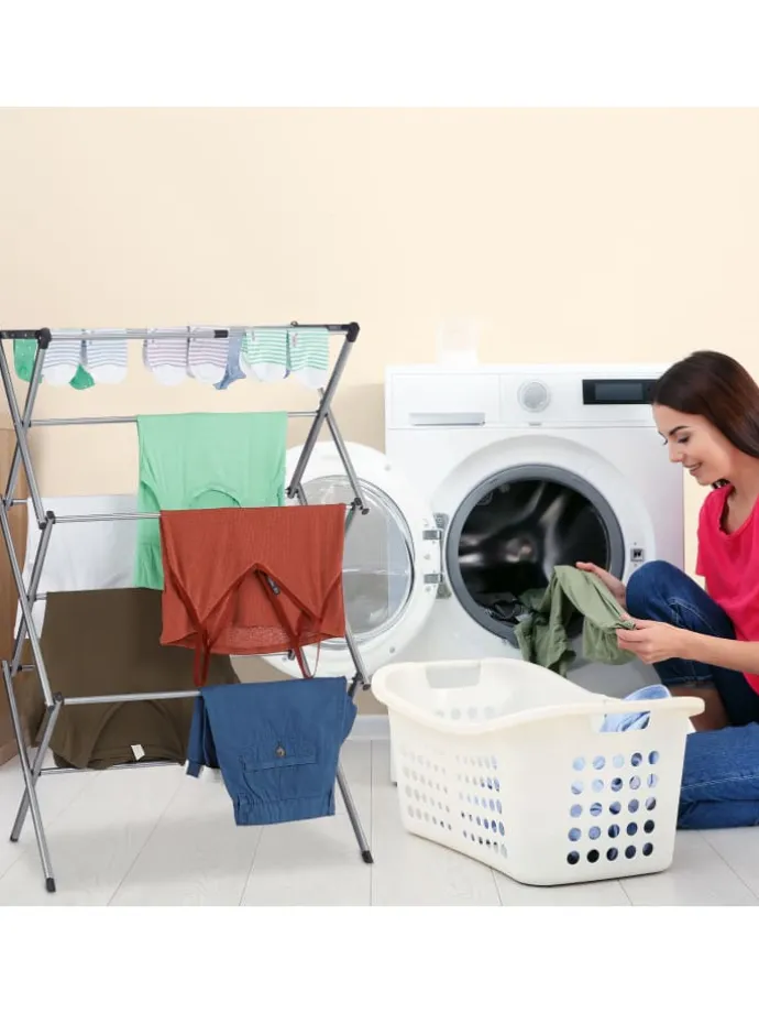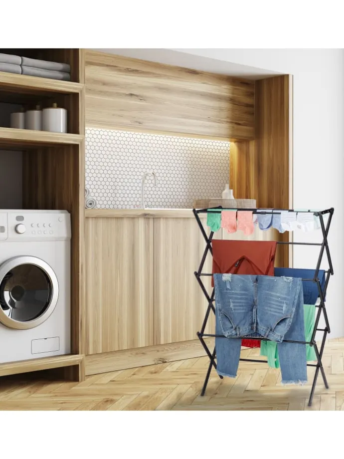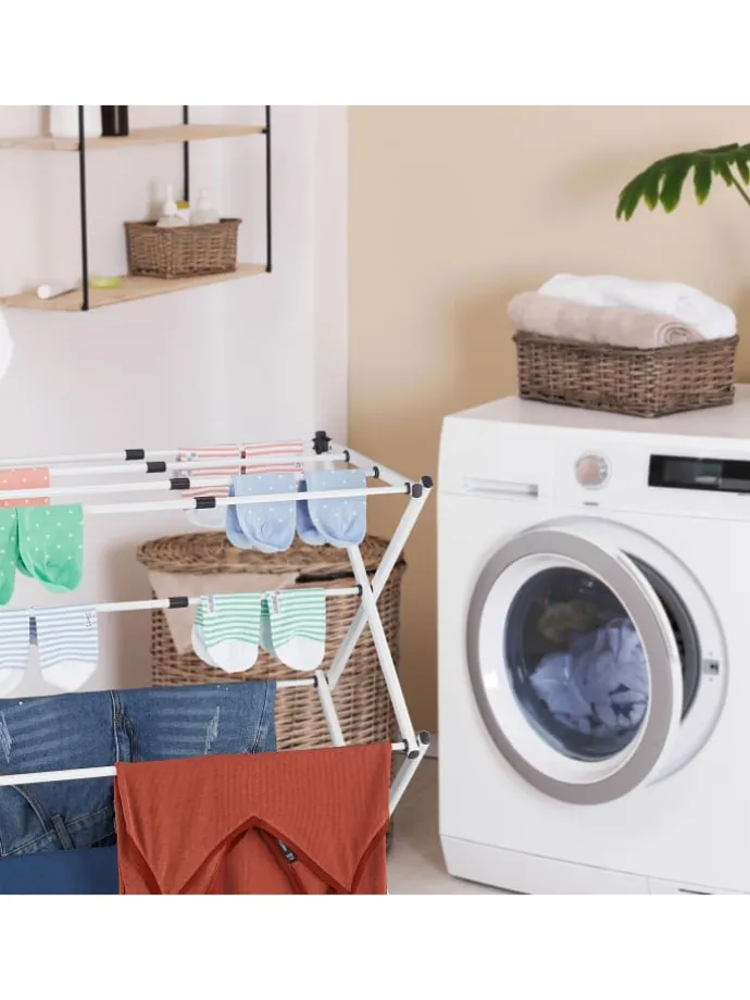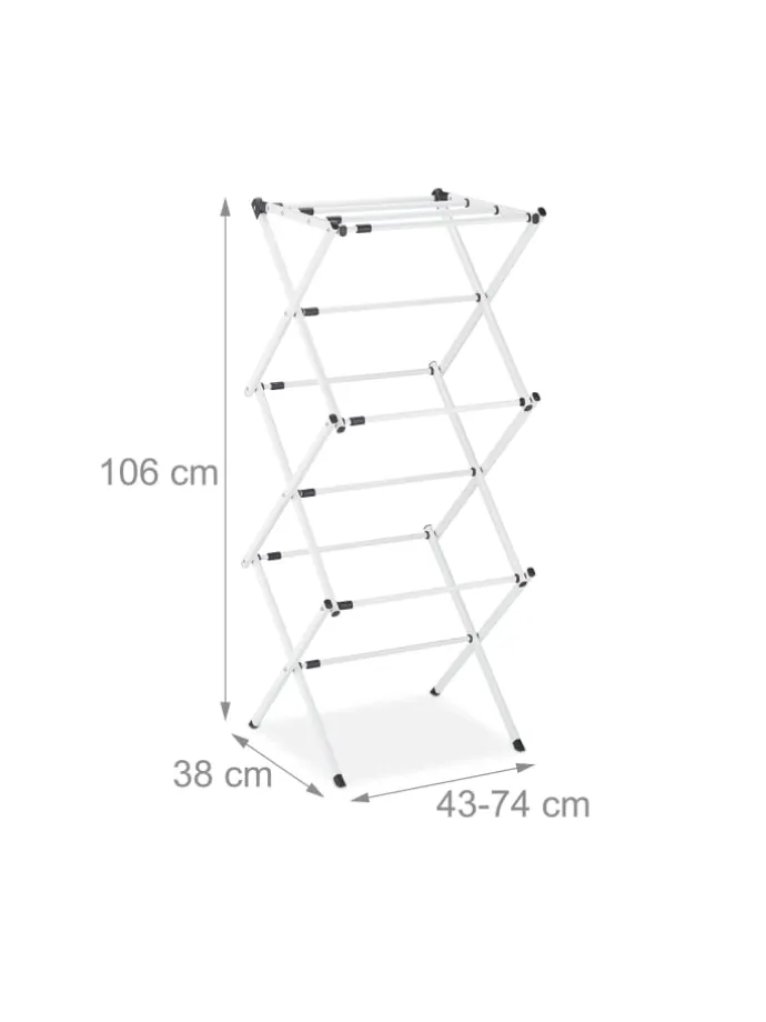 Will man seine Wäsche nach dem Waschgang trocknen, nimmt das oft viel Platz in Anspruch. Eine platzsparende Lösung bietet Ihnen stattdessen dieser faltbare Standtrockner. Auf 6 Ebenen mit insgesamt 11 Stangen können Sie Ihre Oberteile, Hosen oder Unterwäsche aufhängen. Fällt die Waschladung doch mal etwas größer aus, ziehen Sie den kleinen Turmwäscheständer einfach aus. Bei Nichtgebrauch lässt sich der Teleskop-Wäschetrockner flach zusammenklappen und beispielsweise unter dem Bett verstauen.