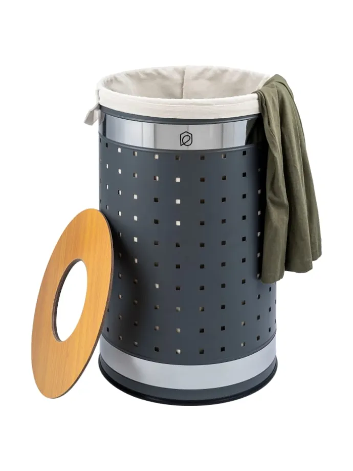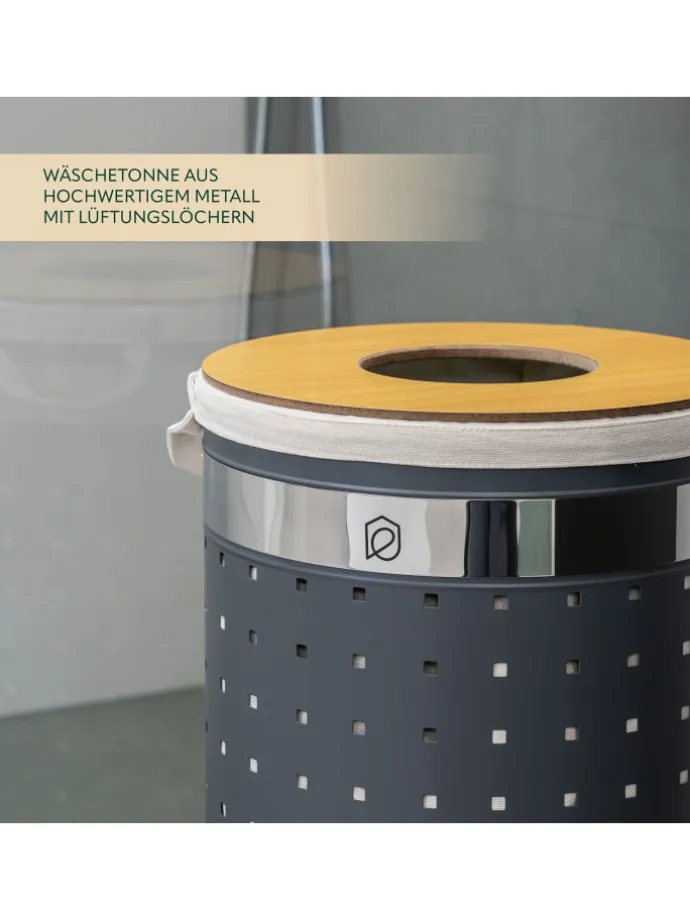 Die eluno Wäschetonne mit einem Volumen von 50 Litern und einem herausnehmbarem Stoffsack ist die perfekte Lösung für Ihre Wäscheaufbewahrung. Die Belüftungslöcher sorgen immer für adäquate Luftzirkulation und verhindern unangenehme Geruchs- und Schimmelbildung. Der moderne Deckel in Holzoptik verleiht der Tonne ein ansprechendes Design, während die hochwertigen Materialien für Langlebigkeit und Stabilität sorgen.