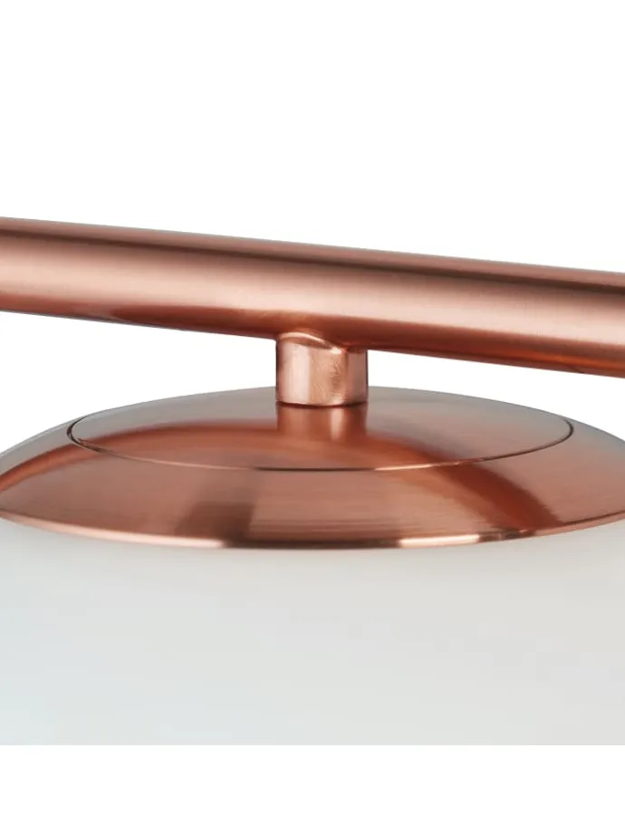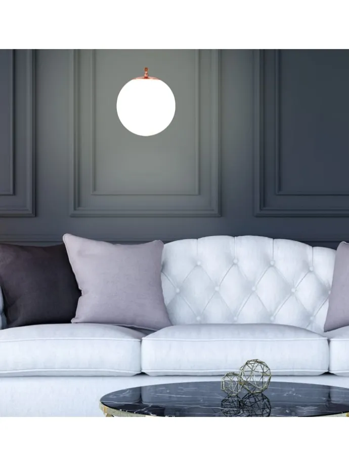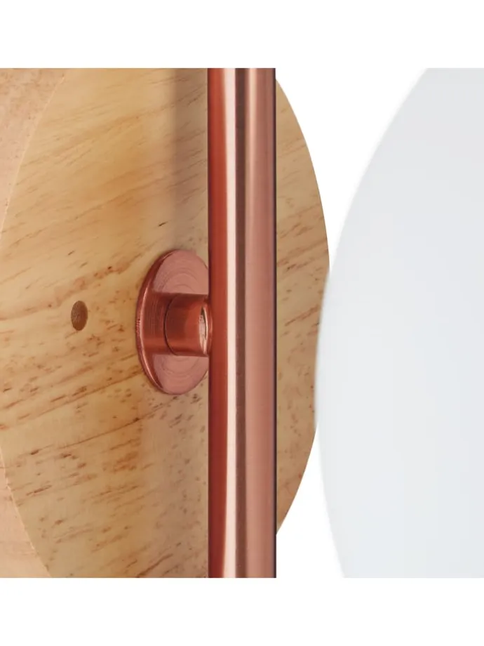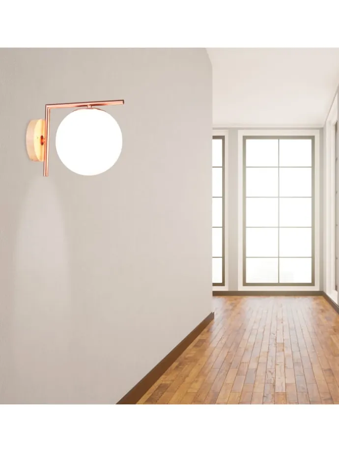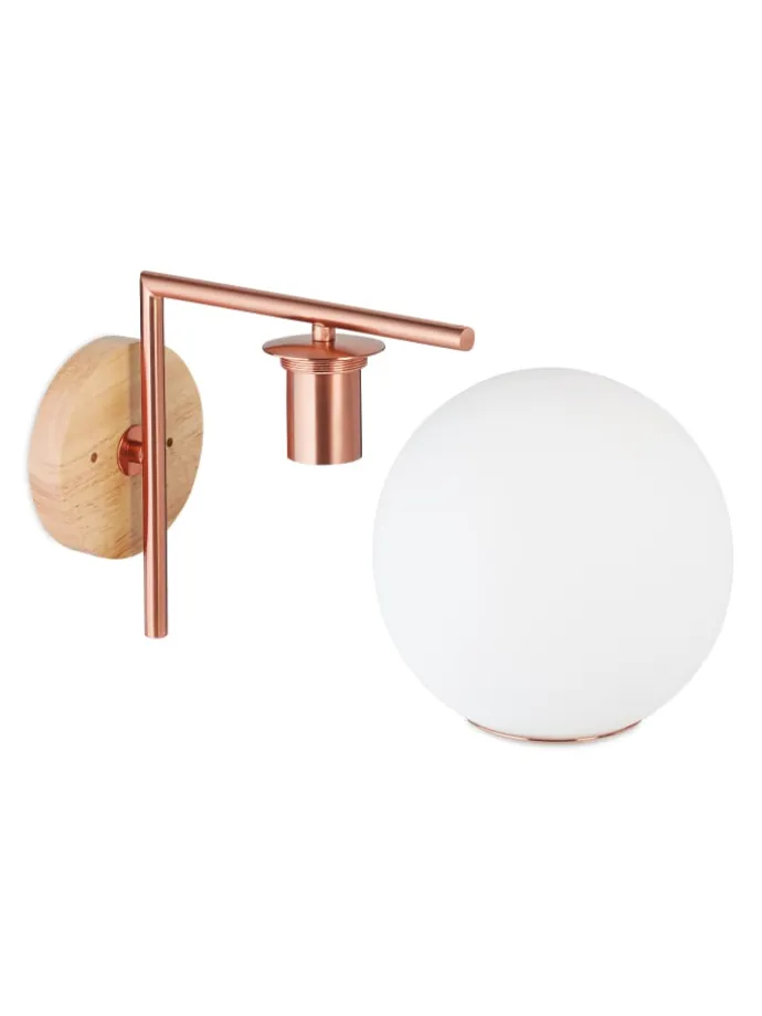 Mit dieser Wandlampe holst Du Dir ein echtes Design-Highlight nach Hause. Der kugelförmige Schirm aus Milchglas sorgt für eine sanfte, diffuse Beleuchtung. Besonders edel wirkt die Halterung aus glänzendem, kupferfarbenem Metall mit ihren geraden Linien. Der Sockel der Kugellampe ist aus Holz gefertigt und vervollständigt den modernen Look. Bringe diese ausgefallene Glasleuchte an der Wand in Deinem Flur, Treppenhaus, Wohn- oder Schlafzimmer an und erfreue dich an ihrem angenehmen Licht.
