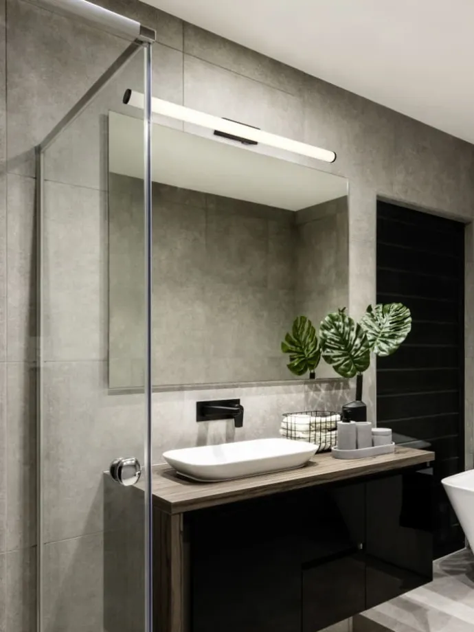 Die schlichte Wandleuchte MATTIMO fügt sich wunderbar in den gewünschten Anwendungsbereich ein. Durch die Schutzart IP44 ist die Leuchte gegen Spritzwasser geschützt und kann problemlos in Feuchträumen wie dem Badezimmer eingesetzt werden. Das längliche Design findet sich optimal neben oder über dem Spiegel im Waschbereich wieder und sorgt für stilsichere Akzente. Darüber hinaus gibt die Leuchte über eine Breite von 80,5 cm ein sanftes und harmonisches Licht aus, welches sich gleichmäßig im Anwendungsbereich verteilt und eine ausreichende Lichtversorgung bietet. Die Leuchte kann wie gewohnt über den Wandschalter oder über einen integrierten Schalter an der Leuchte ein- und ausgeschaltet werden. Die Kombination aus Chrom und weißem Kunststoff lässt sich harmonisch in das Gesamtbild einfügen. Darüber hinaus verfügt die Leuchte über eine moderne LED Technologie, die sich durch eine hohe Lichtqualität und Energieeffizienz auszeichnet. Im Vergleich zu herkömmlichen Halogen Leuchtmitteln lassen sich bis zu 80% der Energiekosten sparen. Zusätzlich haben LED Lichtquellen eine lange Lebensdauer, produzieren weniger Wärme und schonen die Umwelt.