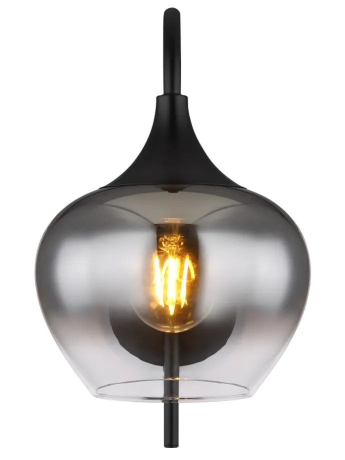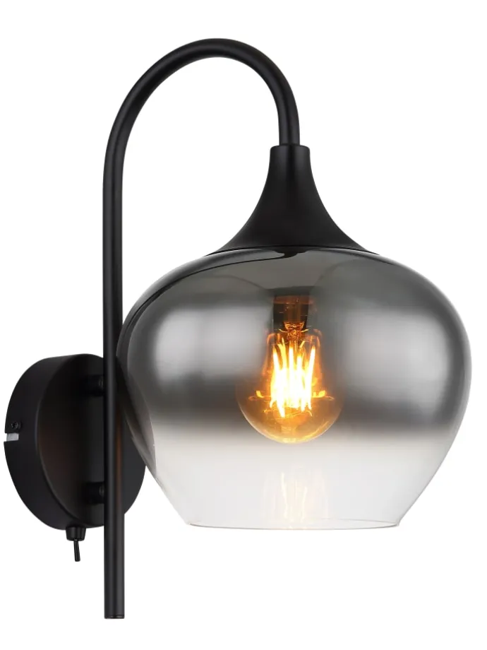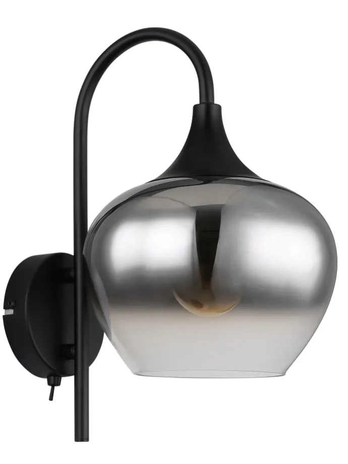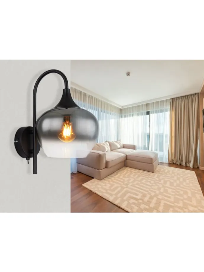 Wandleuchte Metall schwarz matt, Glas rauchfarben, Wippschalter am Artikel, Richtung Lichtschein: abwärts, BxH: 180x320mm, AL: 250mm, exkl. 1x E27 40W 230V