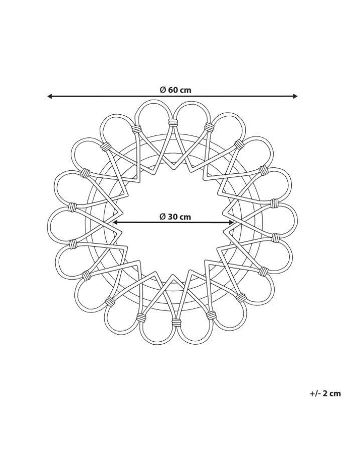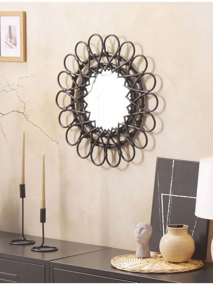 Dekorativer runder Spiegel in Sonnenoptik. Hängen Sie diesen Dekospiegel an die Wand, um Ihrem Wohnbereich eine Boho-Atmosphäre zu verleihen. Das Stück ist aus echtem Rattan gefertigt, was es robust und pflegeleicht macht. Der Rattanrahmen garantiert eine lange Lebensdauer und wertet die Inneneinrichtung Ihres Hauses auf. Der Spiegel kann in Ihrem Wohn- oder Schlafzimmer platziert werden, um den Raum optisch zu vergrößern und so die Aufmerksamkeit Ihrer Gäste auf sich zu ziehen.