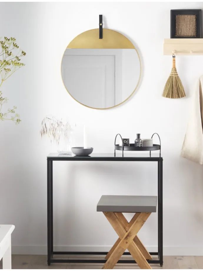 Minimalistischer Deko Spiegel mit rundem Rahmen in Gold und schwarzem Riemen. Die feine Pulverbeschichtung des Rahmens sorgt für die Nachhaltigkeit des Wandschmucks, wobei der goldene Farbton eine luxuriöse Optik vermittelt. So kann das Modell sowohl ein Eyecatcher im Schlaf- und Wohnzimmer, als auch ein praktischer Helfer beim Schminktisch oder im Flur sein. Zudem lässt die Lichtspiegelung jeden Raum nicht nur größer sondern auch heller erscheinen. Werden Sie kreativ und arrangieren Sie den Spiegel mit anderen Wanddekorationen, die zu Ihrem Einrichtungsstil passen.