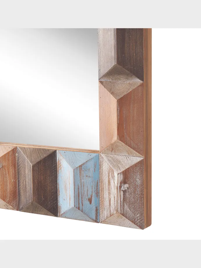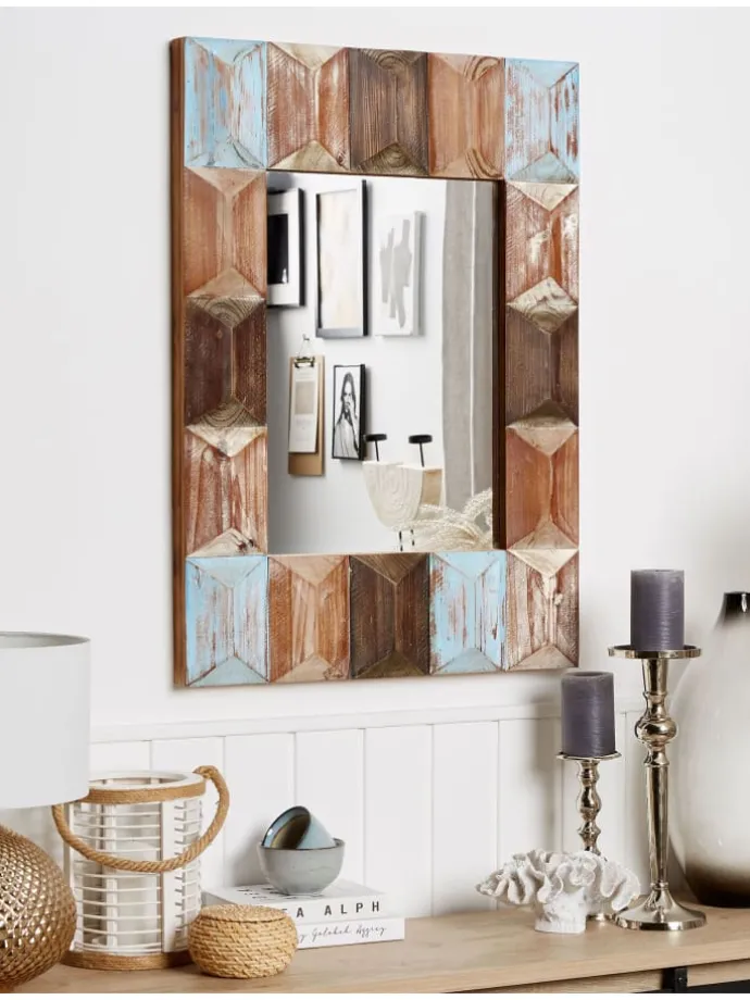 Handgefertigter Spiegel mit dekorativem Holzrahmen in Vintage Optik. Über dem Sofa, der Kommode, Nachttisch oder Bett – kein anderer Wandspiegel wird für so einen gemütlichen, dennoch prägenden Eindruck sorgen. Der breite, rechteckige Rahmen ist aus langlebiger und pflegeleichter chinesischer Spießtanne gefertigt. Die natürlichen dunklen und hellen Holztöne werden mit dezent weißen sowie blauen Farbnuancen vervollständigt, so entsteht eine nostalgische Vintage Wanddekoration. Dieser rechteckige Spiegel wird vollkommen von Hand hergestellt, daher wird jedes Modell bestimmt zu einem unverwechselbaren Schatz in Ihrer Einrichtung werden.