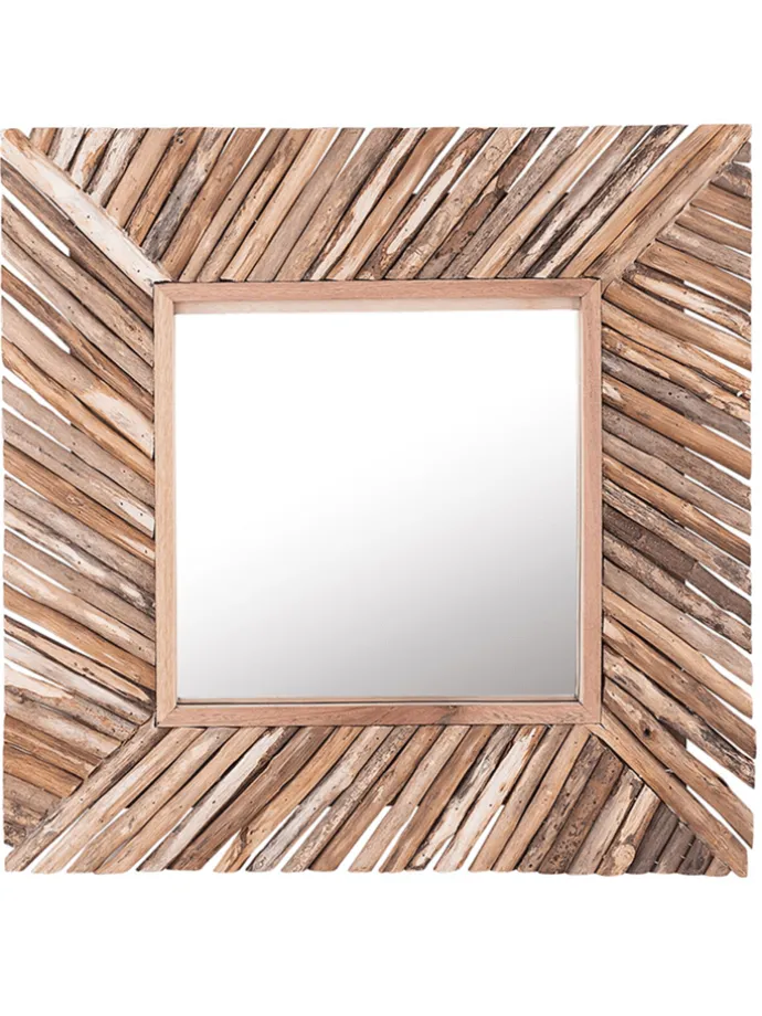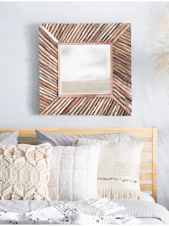 Dekorativer Wandspiegel aus hellem Holz. Ein schöner Spiegel mit einem breiten Rahmen aus verschieden langen und farbigen Stäben, der ein auffälliges Mosaik bildet. Der Spiegel sieht toll aus, wenn er mit anderen Wandelementen aus Holz kombiniert wird. Er passt fantastisch zu offenen, hellen Innenräumen. Dieser präzise gefertigte Wandspiegel wird jedem Raum einen einzigartigen Charakter verleihen.