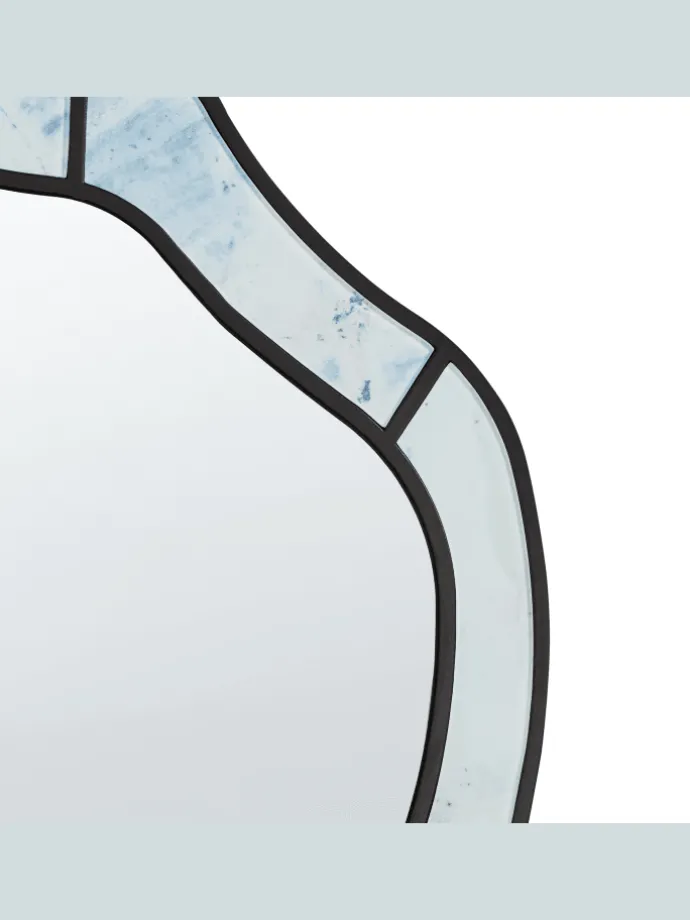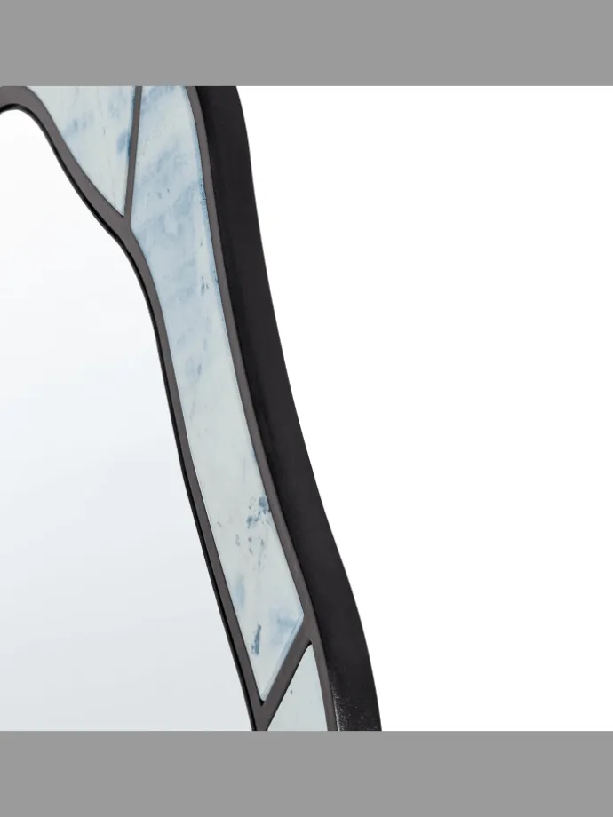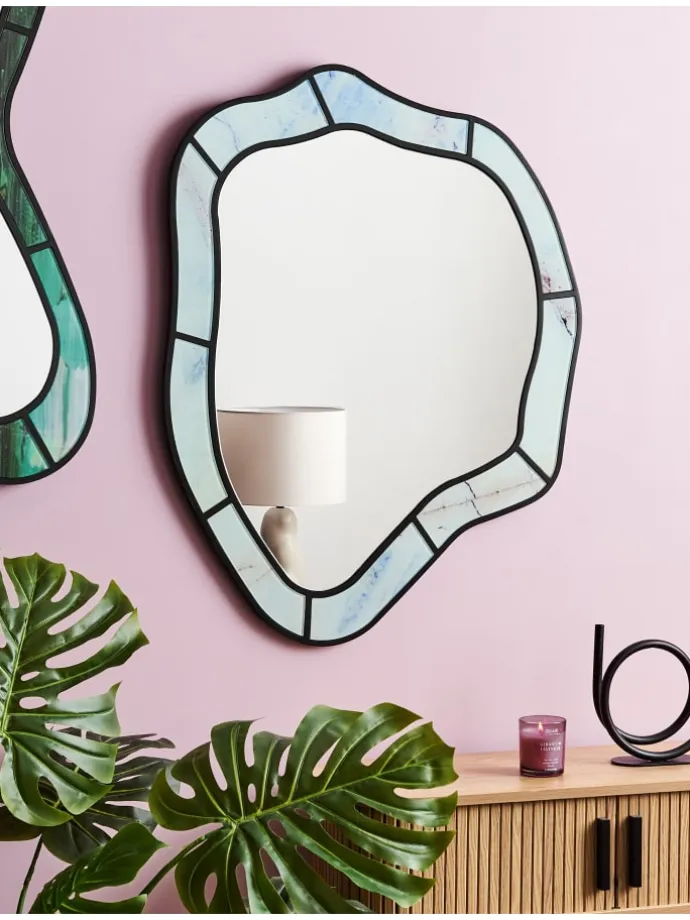 Moderner, asymmterischer Hängespiegel mit breitem Rahmen. Wer seinen Wänden mehr Farbe verleihen und dabei auch einen praktischen Begleiter für sich gewinnen möchte, ist mit diesem einzigartigen Dekospiegel bestens beraten. Seine robuste MDF-Rückseite ist mit integrierten Aufhängern versehen, die das Anbringen des Spiegels zum Kinderspiel machen. Die hellblauen Details erinnern mit ihrer Optik leicht an Marmorstein und sind mit abgerundeten Kanten ergänzt. Dank des originellen Farbverlaufs verzaubert der Spiegel mit einem unvergleichlichen Retro-Design, das ihn auf Ihrer Wand sicherlich auffallen lässt.